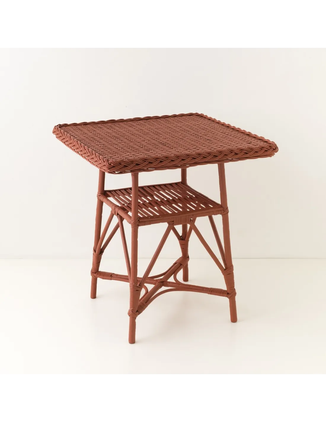 The Mélina 70x70 willow table is dining room height, making it perfect for breakfast or a snack for two. 70x70 is also the most common size for café terraces and 2-person tables in bistros or brasseries. It can also be used as a small office area, or as an occasional table in a hallway. The top of the table is woven from willow splinters in the same colour as the rest of the furniture, laid on a wooden support to give the surface stability and rigidity. The Mélina willow table has a 40x40 cm sub-top on which you can place objects. It is available here in several matte lacquer colors, with a finish made to order (delivery time approximately 15 days to 3 weeks) in France.