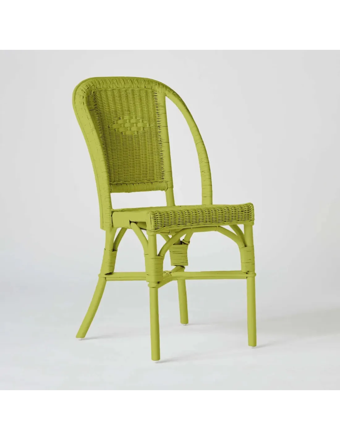 Our Primavera woven rattan chair is not designed for outdoor use, although it can be taken outside in summer on an exceptional basis. It must be protected from direct sunlight by leaving it in the shade and bringing it inside every evening or in case of bad weather or heavy dew in the morning. We have therefore designed a reinforced version: the Guinguette resin chair, featuring natural-coloured synthetic rattan weaving instead of rattan pith. The Guinguette chair will be more resistant than the Primavera white lacquered woven rattan chair, both to bad weather and intensive use, and will therefore be ideal for a restaurant or guest house, while offering exactly the same silhouette.