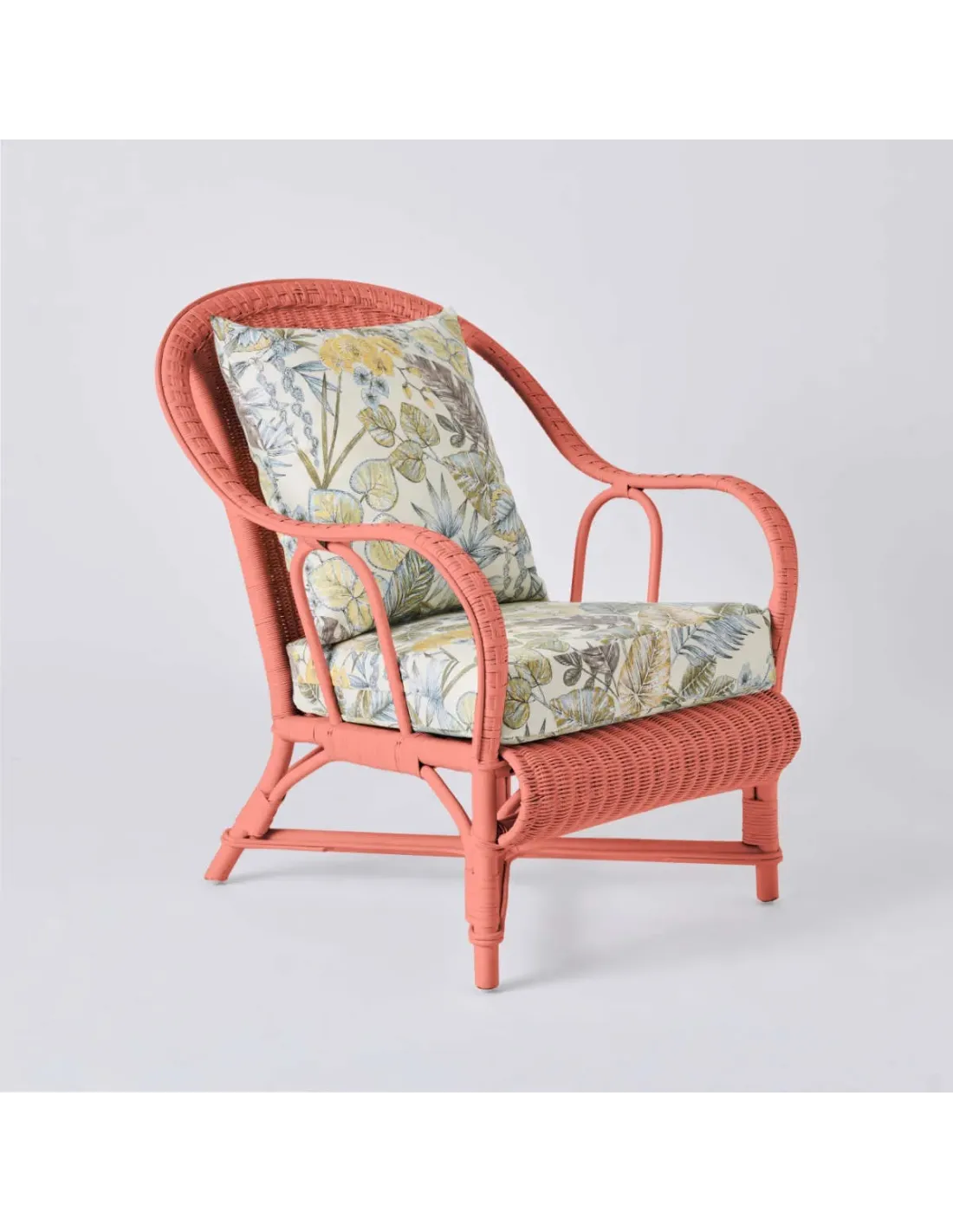 PRIMAVERA collection armchair in coral-coloured lacquered rattan with bouquet yellow fabric
