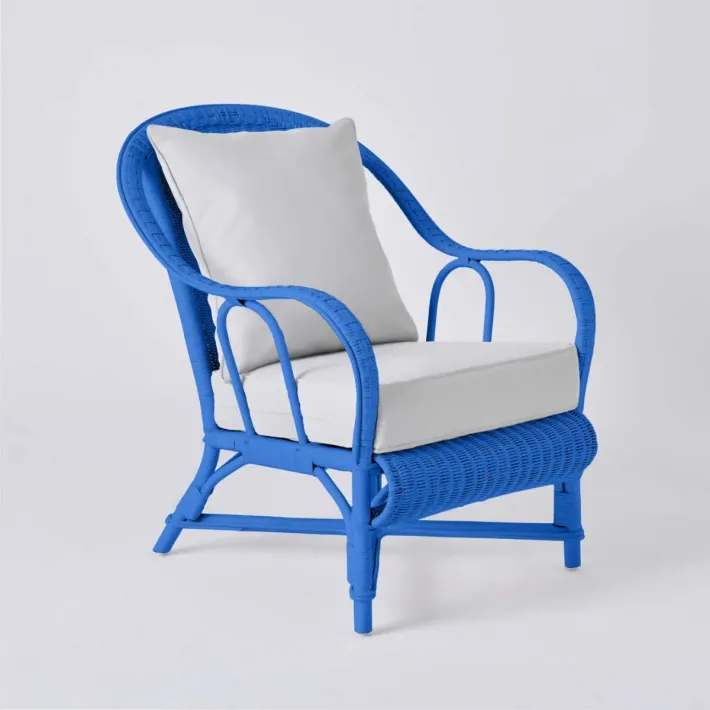 PRIMAVERA collection armchair in Greek blue lacquered rattan with pearl grey fabric