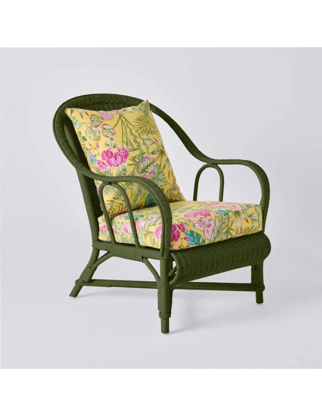 PRIMAVERA collection armchair in bronze green lacquered rattan with bouquet yellow fabric