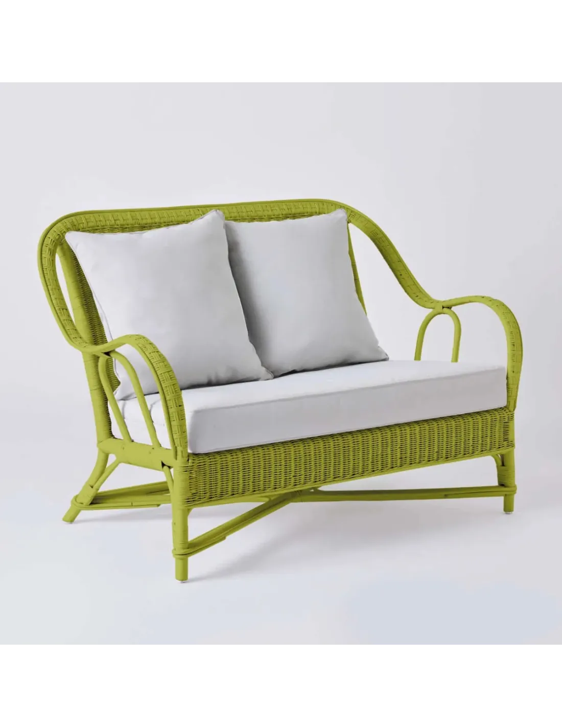 2-seater sofa from the PRIMAVERA collection in grass green lacquered rattan with pearl grey fabric