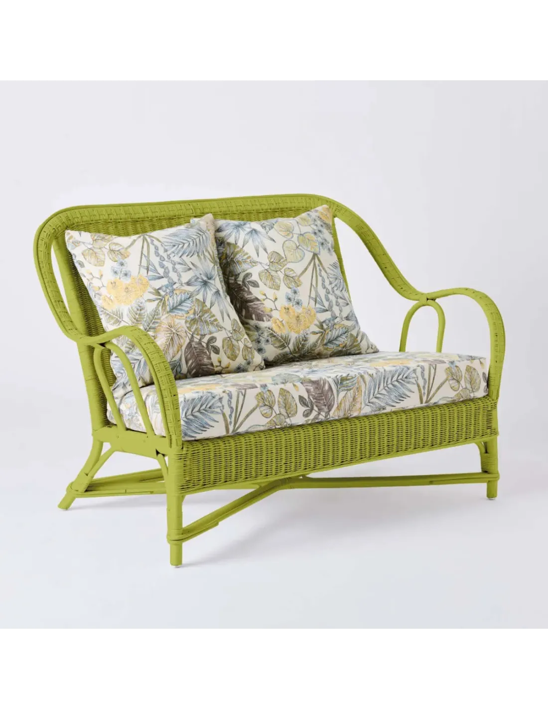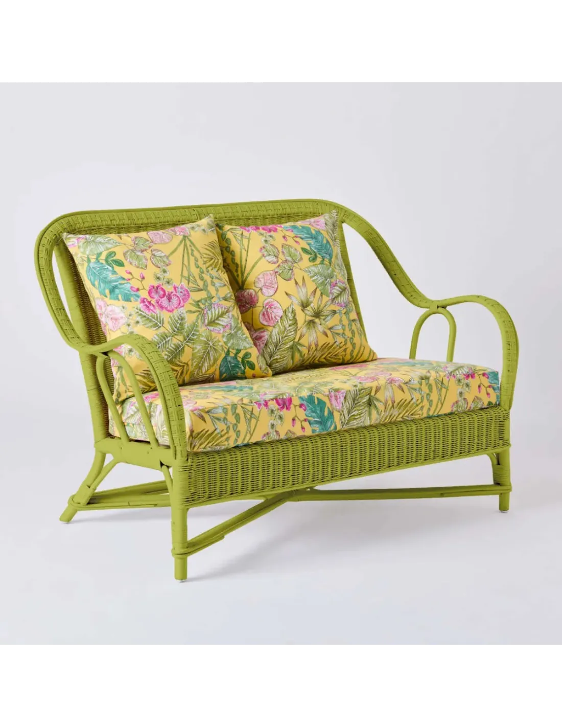 2-seater sofa from the PRIMAVERA collection in grass green lacquered rattan with bouquet yellow fabric