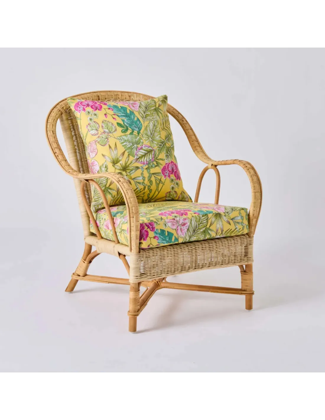 NANTUCKET woven rattan armchair with bouquet yellow fabric