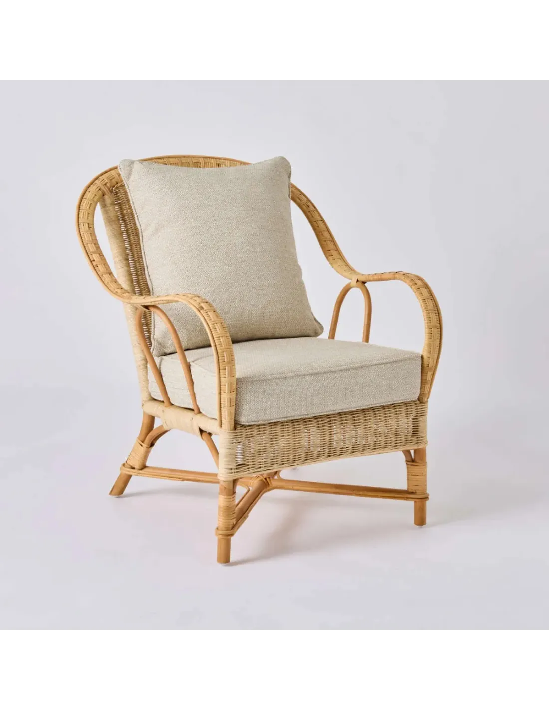 The Nantucket natural rattan armchair is inspired by the famous grand-père armchairs in rattan, but is presented here in a supremely comfortable version. At normal lounge seating height, it comes with a fully removable cushion. Lightweight and natural, this rattan armchair is very easy to move, and is designed to make your life easier. It requires little or no maintenance, and can be used in the living room, on a veranda, or even outside if it is not raining. It is not afraid of a little morning dew, but it should be protected in case of heavy rain or prolonged cold.
