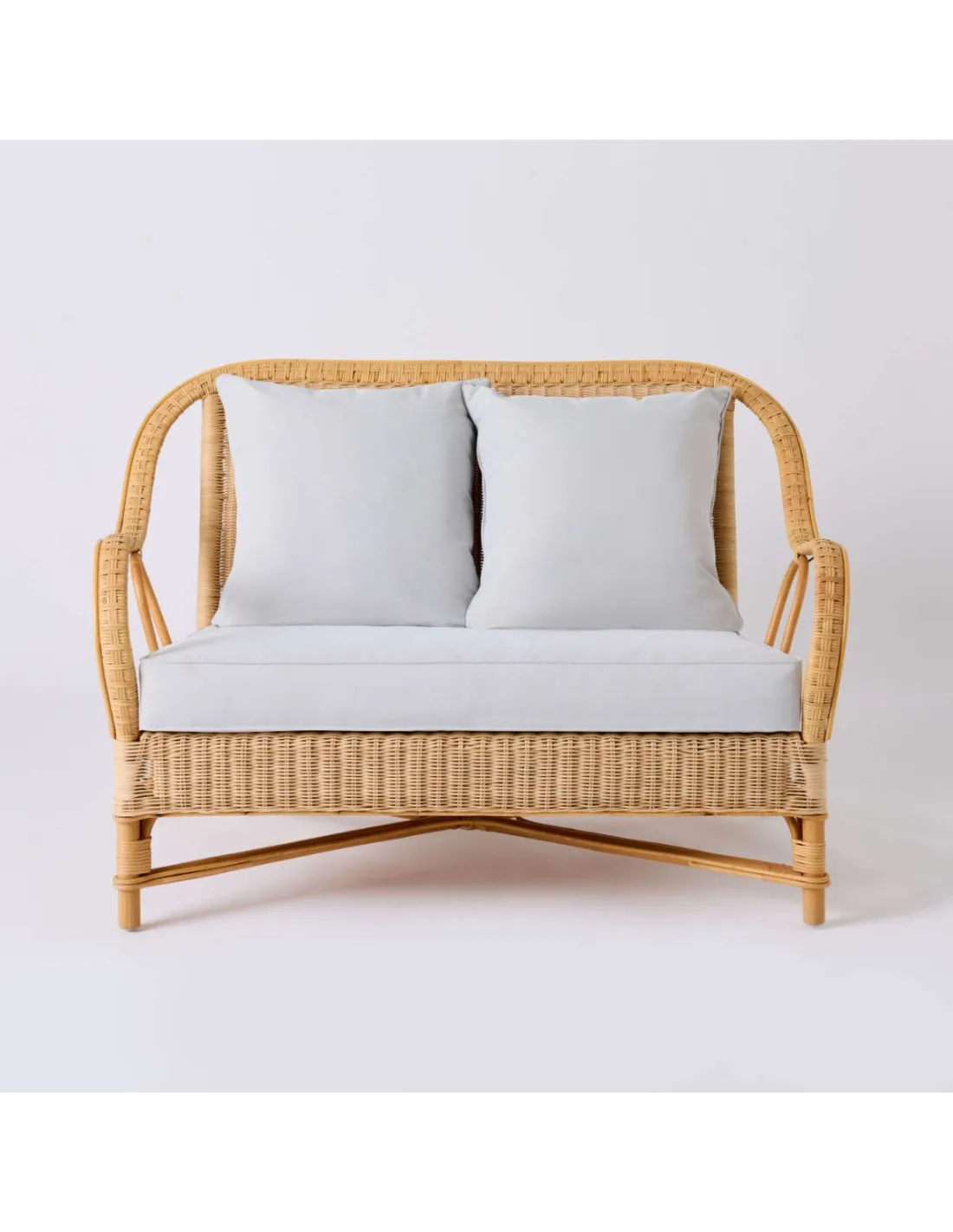 Front view of NANTUCKET natural rattan sofa from the Grandfather collection in pearl grey fabric
