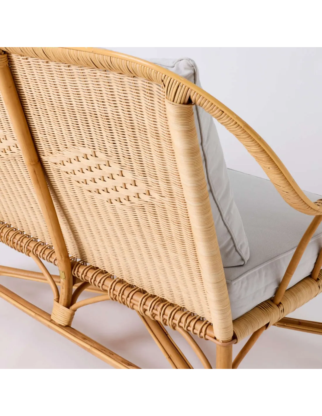 Zoom on the weave and diamond pattern of the NANTUCKET natural rattan sofa from the Grandfather collection in pearl grey fabric