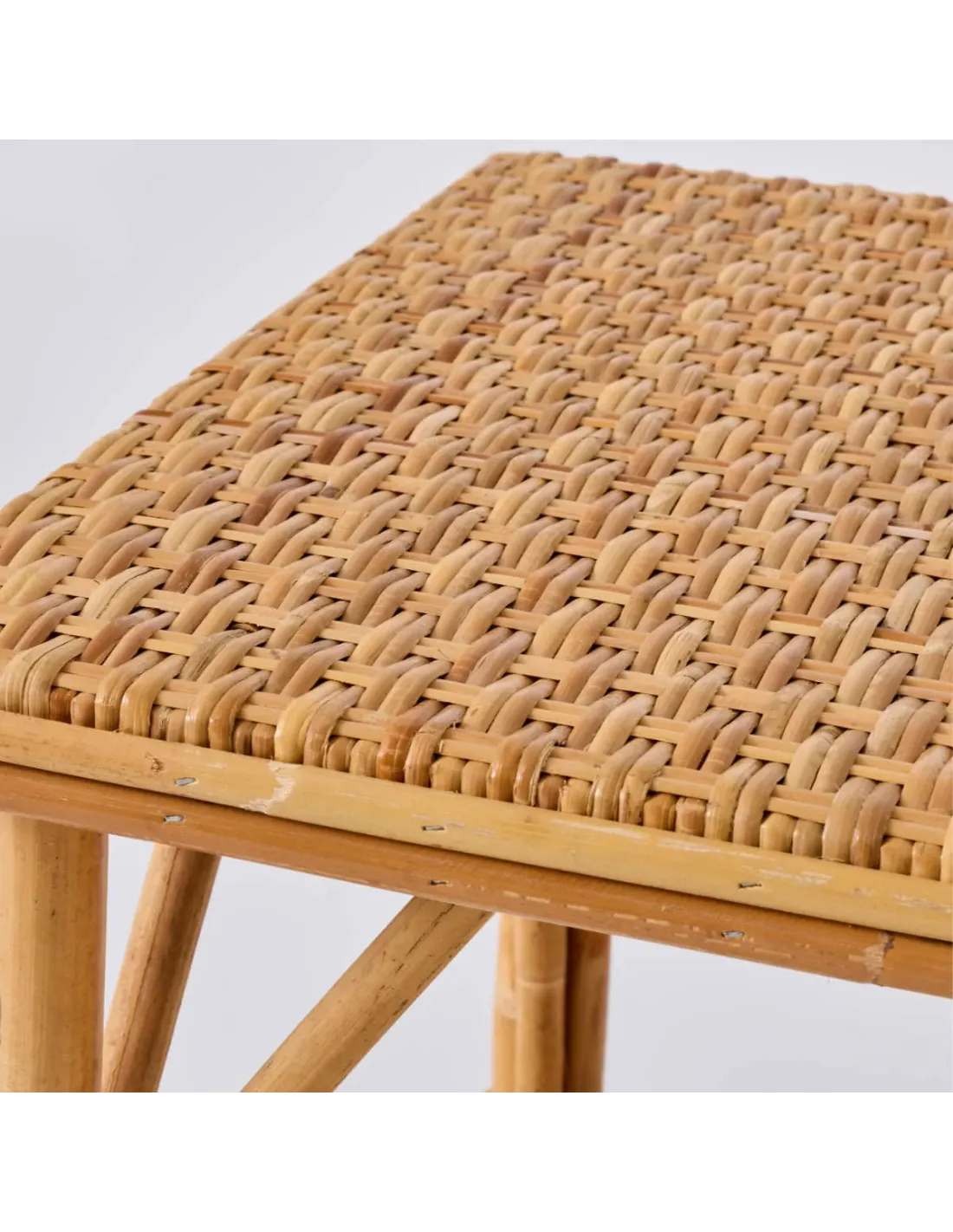 Structure en rotin naturel avec écorce, plateau en contreplaqué habillé de tissage en éclisse de rotin. Patiné à l'ancienne.