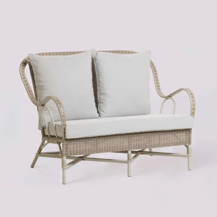 Frame in powder-coated aluminium, 2.5 mm Ecolène brand HDPE (high density polyethylene) synthetic resin, in a mixture of colours ""in the mass"" to create a mottled colour, entirely hand-made by master craftsmen. Foams: 30kg/m3 for the seat cushions and polyether wadding for the back cushions, 100% olefin UV-resistant and washable ""outdoor"" fabric, removable covers.