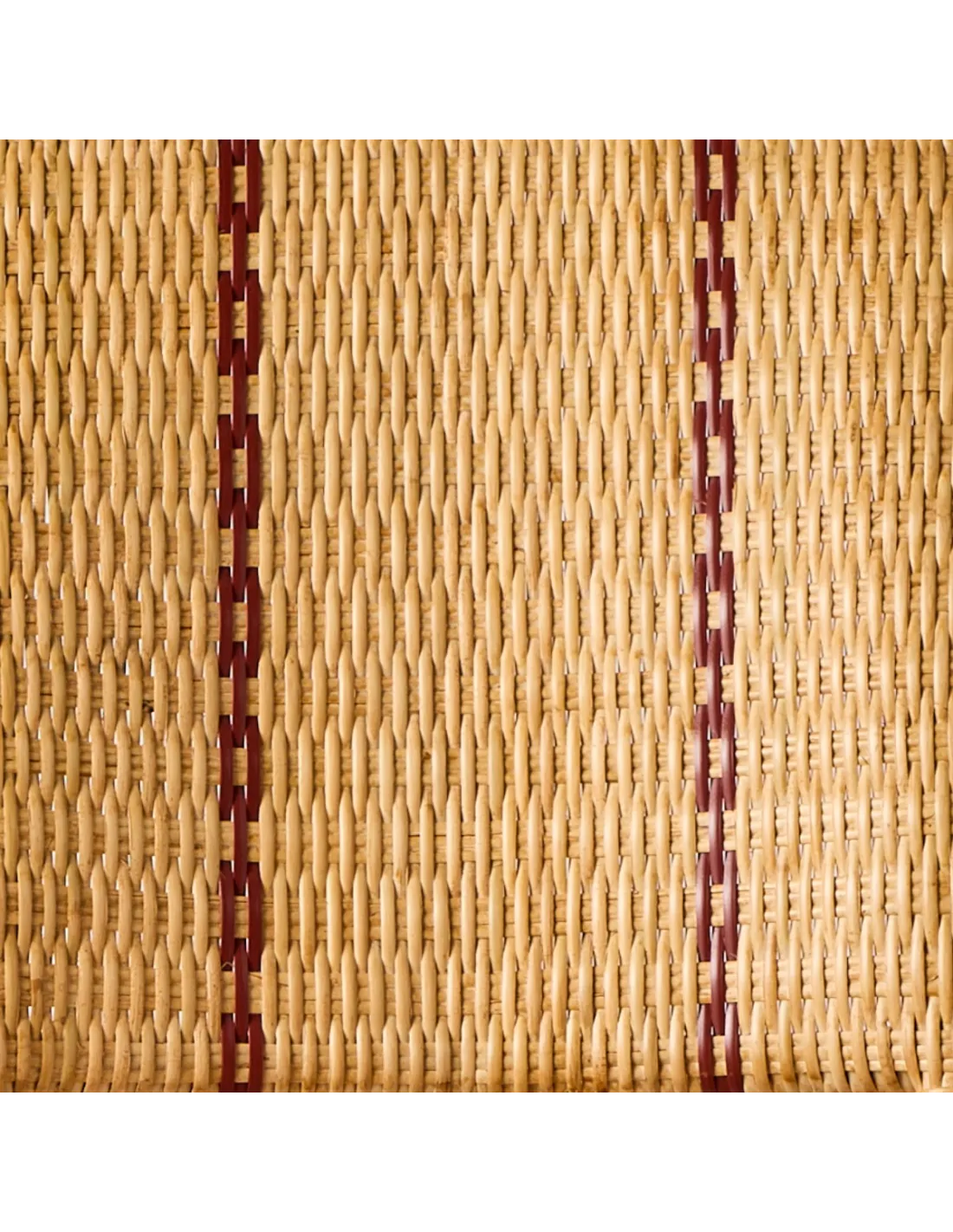 - Structure rotin non écorcé foncé naturel, tressage en éclisse de rotin patinée et filets en résine PEHD (parties rouges), cadre d'assise en bois massif garni de sangles. Vernis à l'eau satiné. Patins en nylon sous chaque pied.