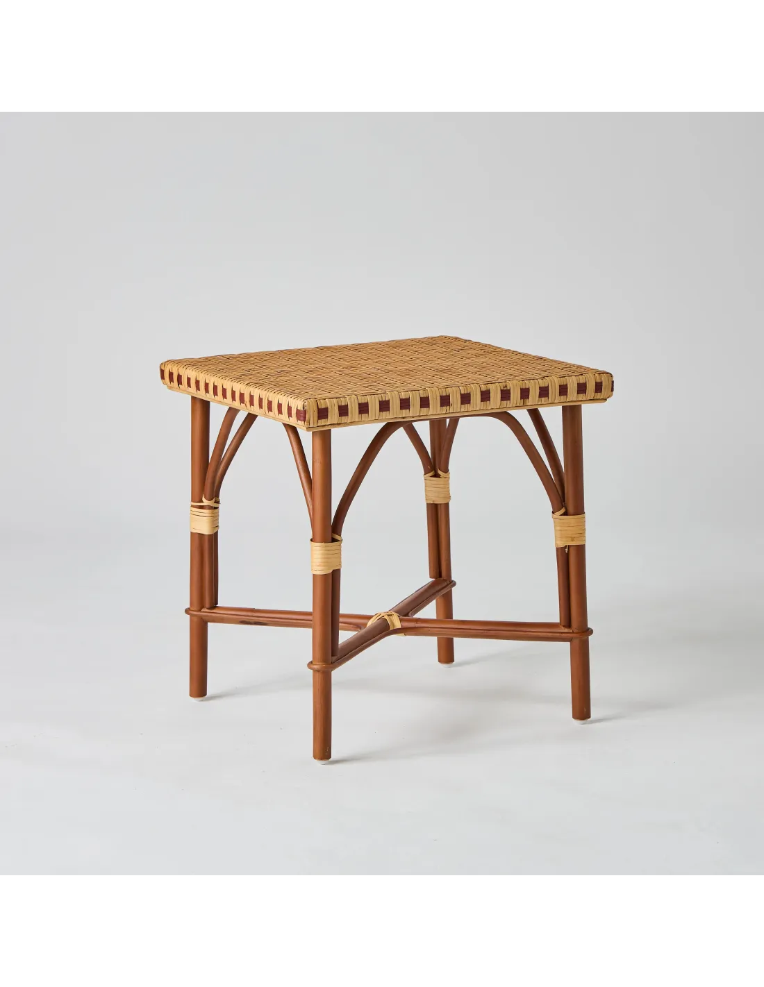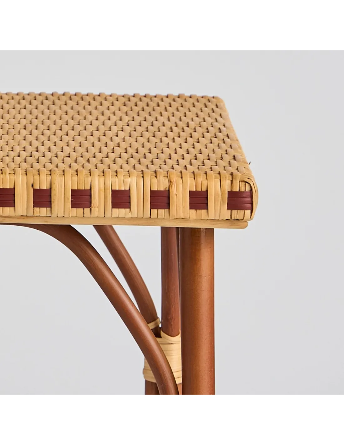 Overall dimensions: height 52 x width 49 x depth 49. Weight 4 kg. Natural dark unpeeled rattan frame, patinated rattan weaving and HDPE resin (red sections). Satin water-based varnish. Delivered assembled. Made in Indonesia. A glass top is offered as an option.