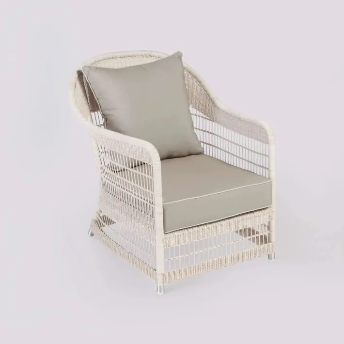 Fauteuil de jardin Biarritz en résine de synthèse coloris crème avec son coussinage complet.