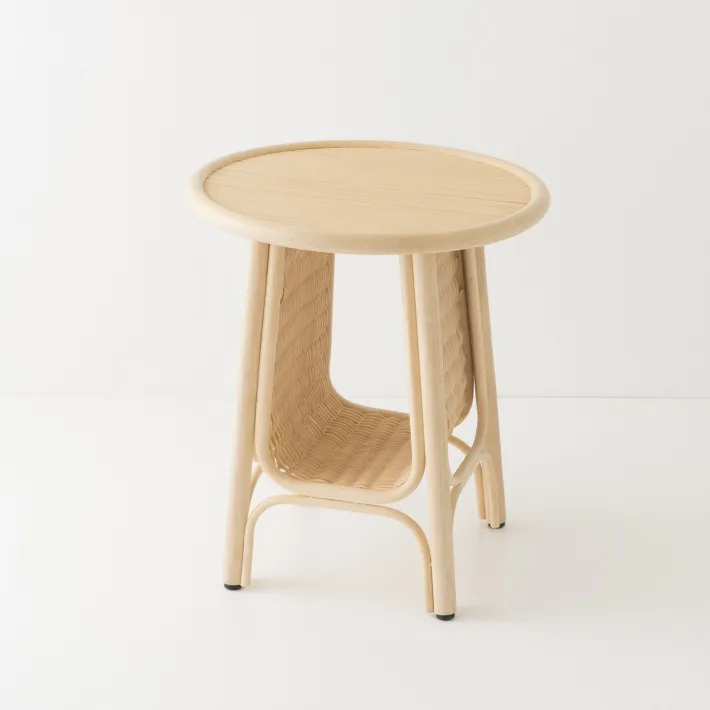 Structure: canne de rotin écorcée. Rangement tissé en moelle de rotin. Plateau en contreplaqué 8 mm habillé de marqueterie en baguettes de rotin naturel. Finition vernis mat à l'eau. Chaque pied est équipé de patins double face (une face nylon, une face feutre) permutables et remplaçables facilement. Dimensions hors-tout: diamètre 50 cm x hauteur 55 cm. Poids 4 kg. Fabrication Indonésie. Livré montée.