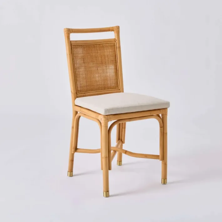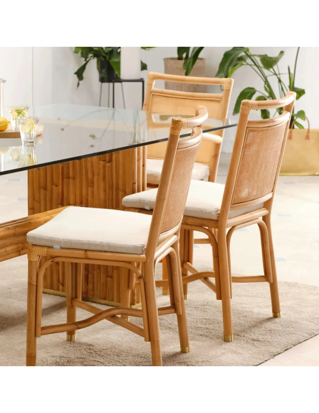 Inspirée des lignes du rotin naturel des années 70-80 la chaise rotin Riviera en reprend les codes graphiques caractéristiques : rotin au diamètre généreux, formes épurées, dimensions compactes, finitions haut de gamme : coussin déhoussable, dossiers garnis en double cannage, cabochons en laiton en bas de chaque pied... Une petite touche de naturel toute en élégance.