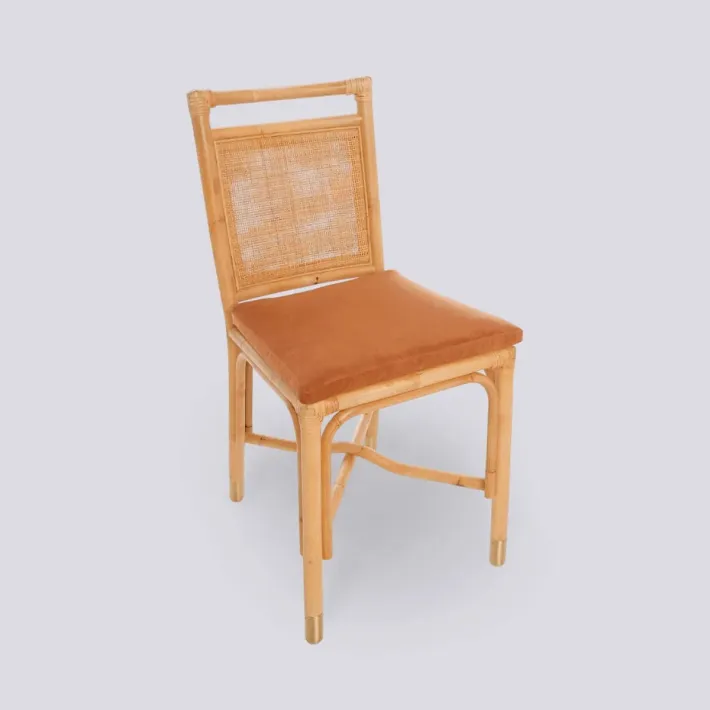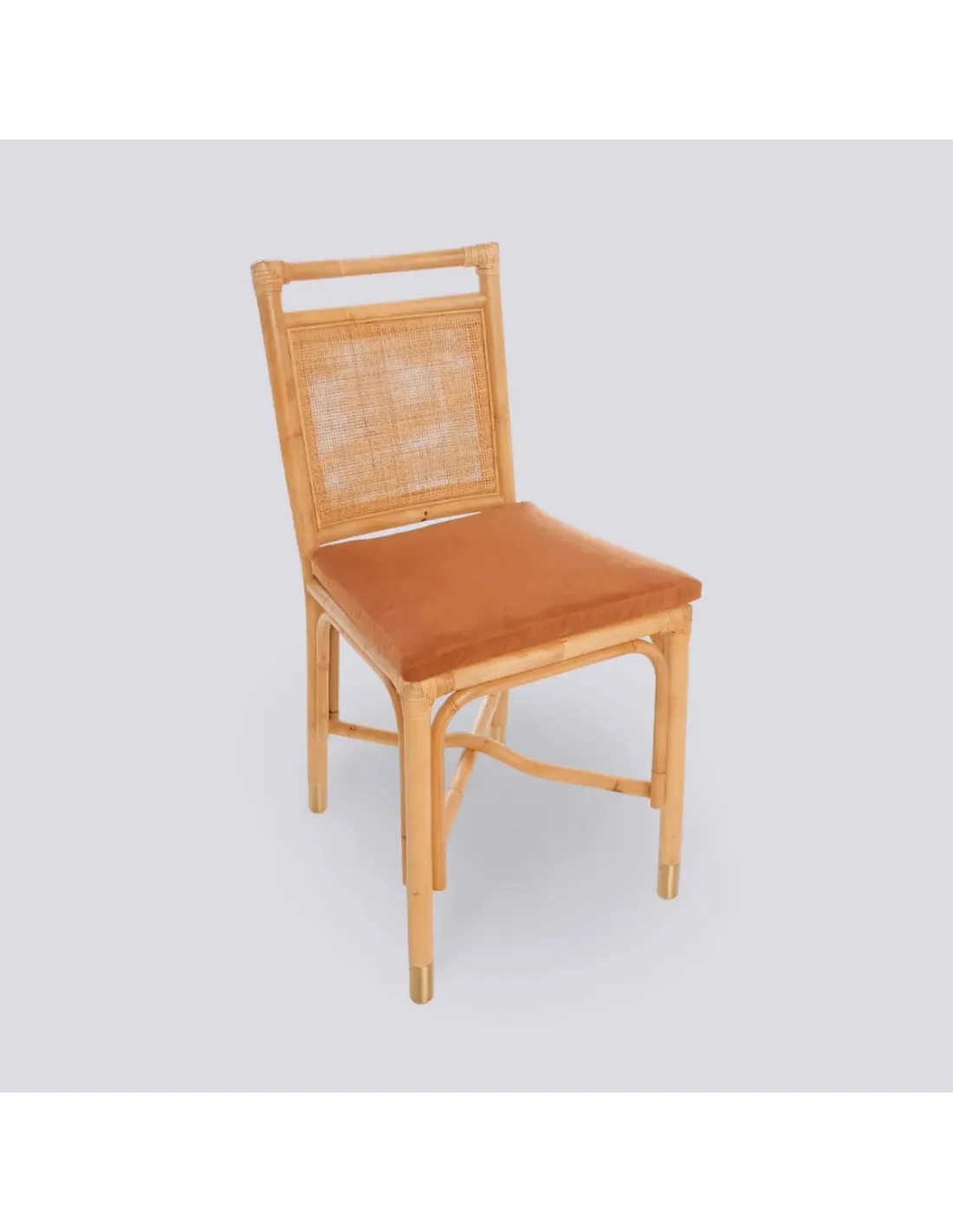 Inspirée des lignes du rotin des années 70-80 la chaise rotin Riviera en reprend les codes graphiques caractéristiques: rotin au diamètre généreux, formes simples et classiques, dimensions compactes, finitions luxueuses : coussin déhoussable garni de tissu en velours, double cannage en garniture des dossiers, cabochons en laiton... Le naturel bien domestiqué, cossu et tout en élégance de la chaise rotin Riviera ne fait aucune concession aux sièges les plus hauts de gamme du marché, tous matériaux confondus.