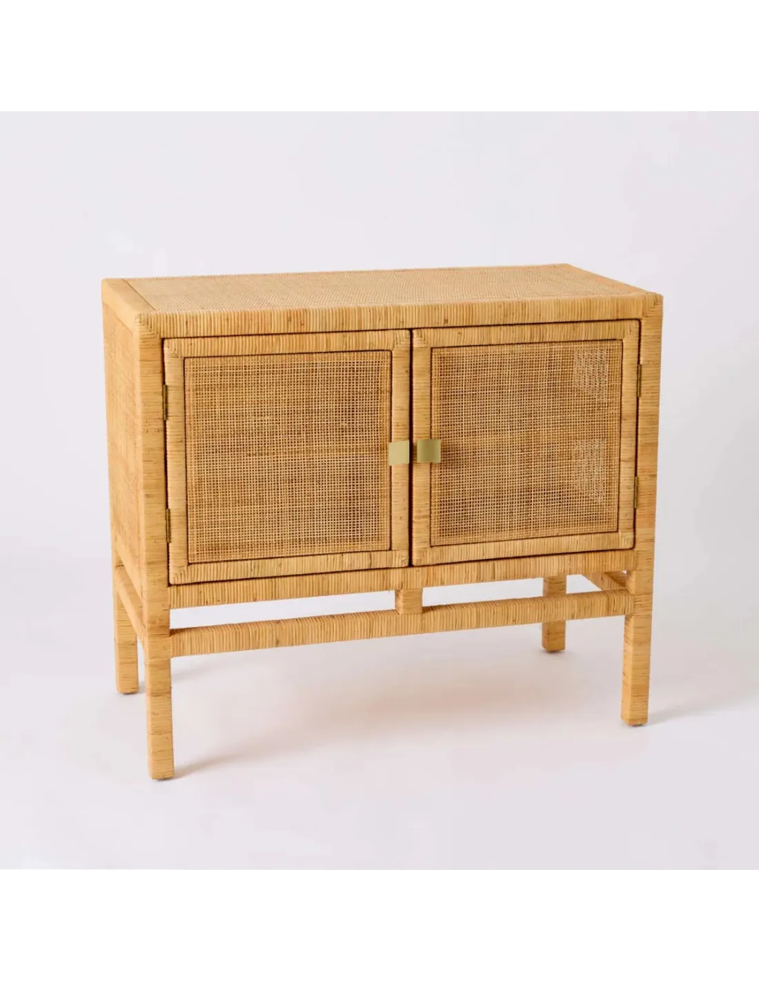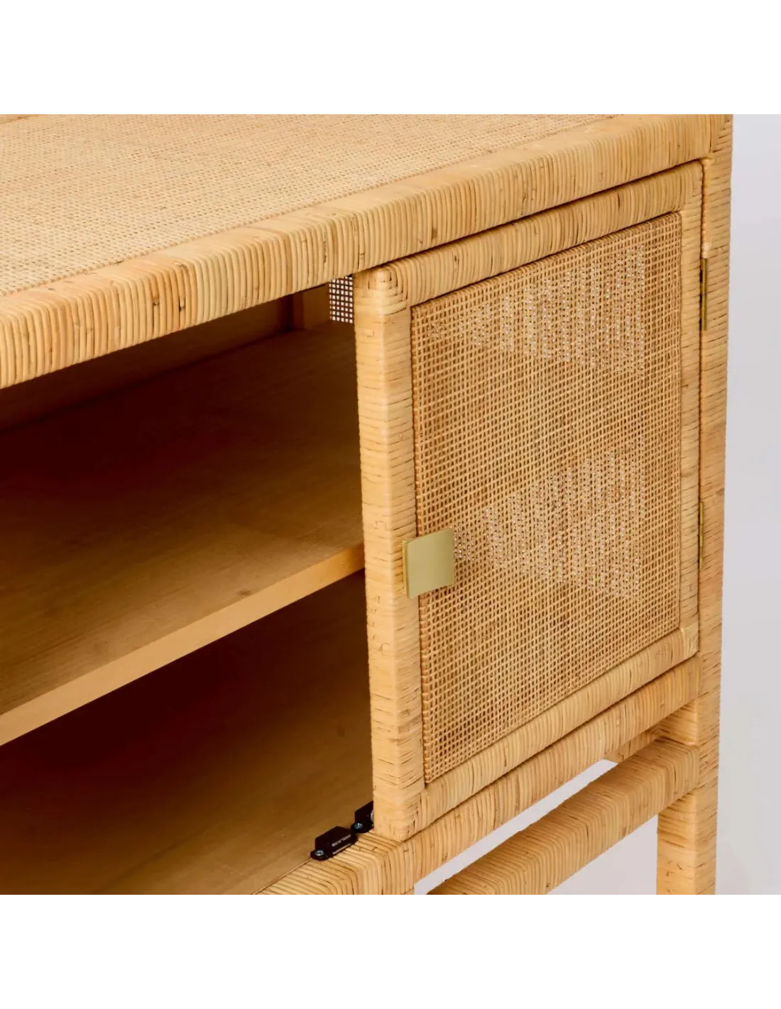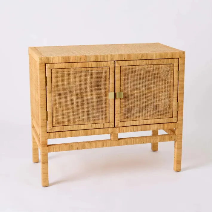 Tressage en éclisse de rotin naturel. Structure en pin massif. Etagère intérieure en pin massif amovible mais non réglable en hauteur, poignées laiton livrées démontées (montage facile). Patins en nylon sous chaque pied.