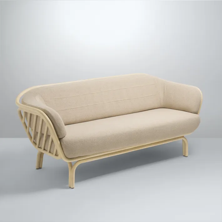 "Pour BôA nous avons dessiné un sofa structuré par de la canne de rotin de gros diamètre. C’est ce travail sur le contour de l’objet qui a permis l’intégration de fenêtres de cannage déterminant ainsi le dossier et les accoudoirs. Un soin particulier a été apporté au coussinage afin qu’il assure un très bon niveau de confort." Maxence Boisseau et Nelson Alves