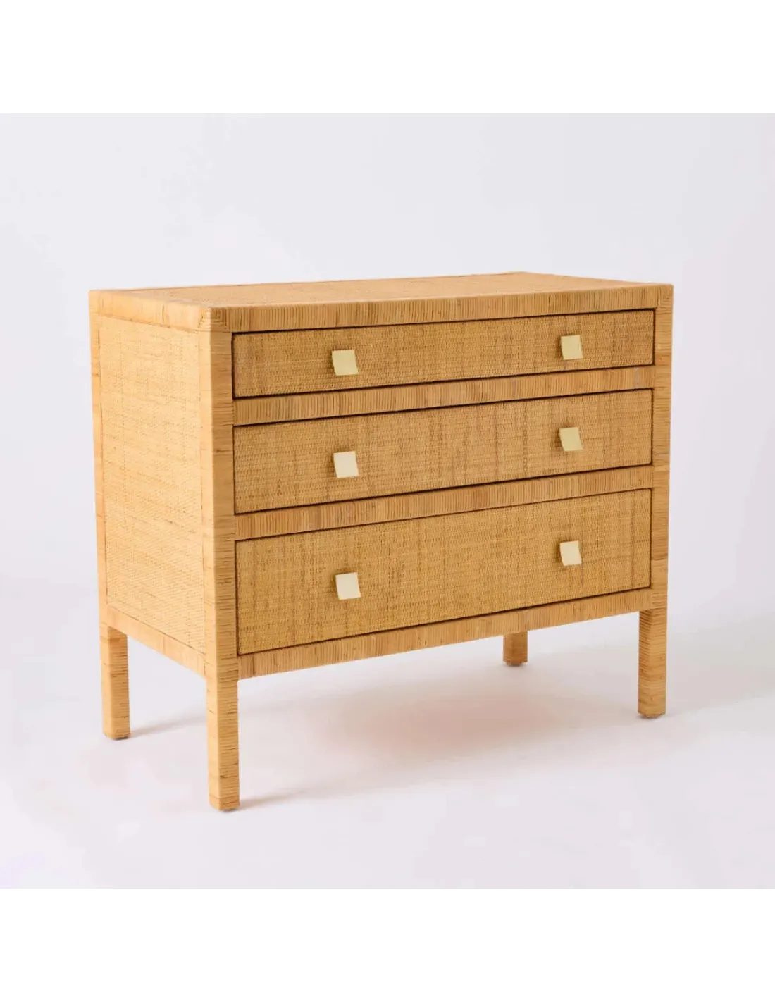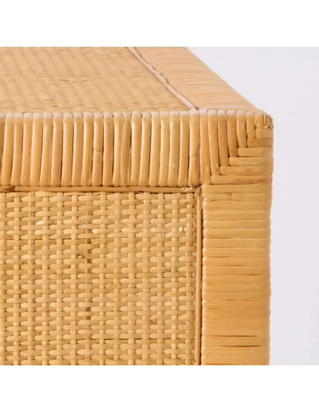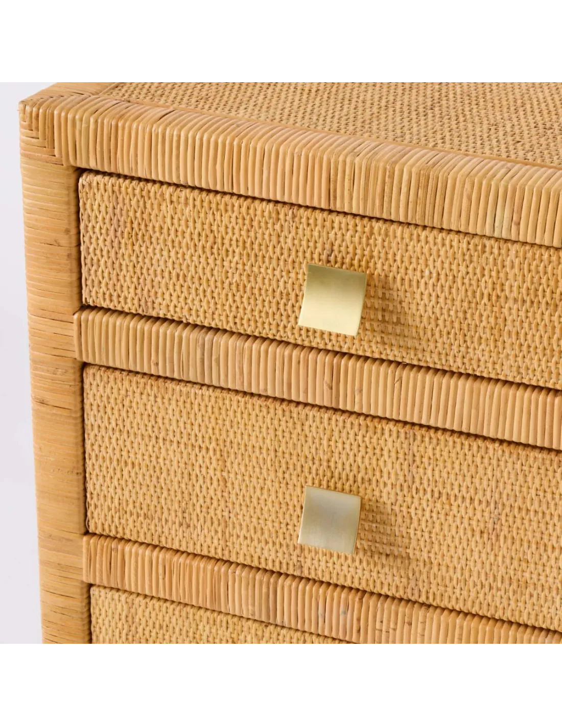 Tressage en éclisse de rotin naturel. Structure en pin massif. Fond du meuble, des tiroirs en contreplaqué. Côtés des tiroirs en pin massif. Tiroirs sur glissières métalliques à roulement. Finition vernis naturel à l'eau. Poignées laiton livrées démontées (montage facile). Patins en nylon sous chaque pied.