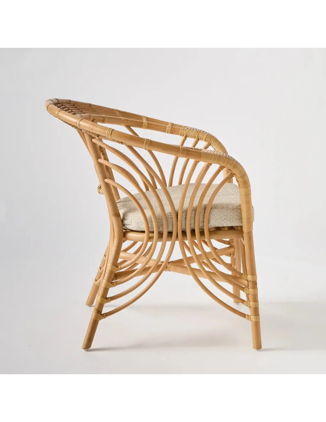 Le fauteuil SHANGHAI met en oeuvre les codes graphique du rotin "exotique" et "tropical": palmettes, collerettes, volumes généreux, courbes omniprésentes. Tout aussi spectaculaire qu'un fauteuil Emmanuelle, mais plus confortable et moins encombrant, il enchantera à lui tout seul l'atmosphère d'une pièce, d'une véranda ou d'un jardin d'hiver. Muni d'un coussin déhoussable, il est suffisamment haut d'assise pour être installé autour d'une table de salle à manger ou devant un bureau. Des personnes ayant des difficultés motrices pourront s'y asseoir et s'en relever facilement.