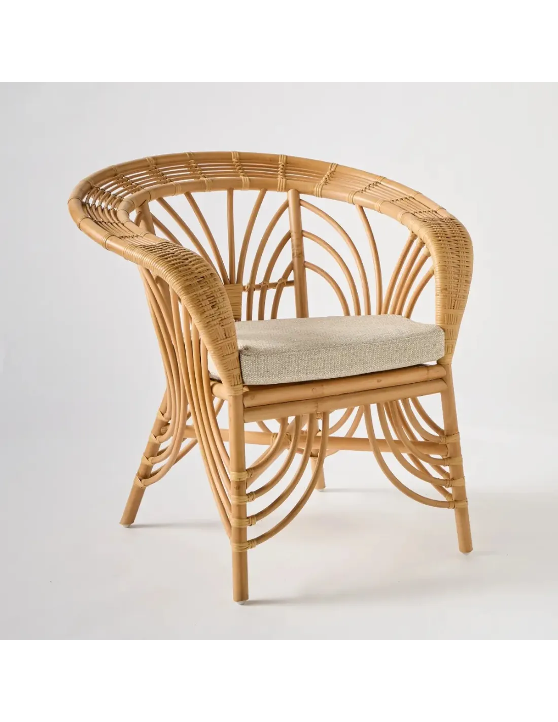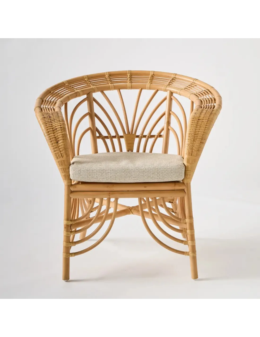 Fabrication Indonésie. Structure en canne de rotin demi-écorcé, teintée, vernis à l'eau, ligatures en éclisse de rotin. Coussin déhoussable en mousse de polyuréthane densité 30 kg/m3 recouvert de ouate de polyéther. Tissu 100% oléfine (polypropylène) reésistant aux UV et à la moisissure, lavable à froid. Pieds du fauteuil équipé de patins en PEHD (polyéthylène haute densité).