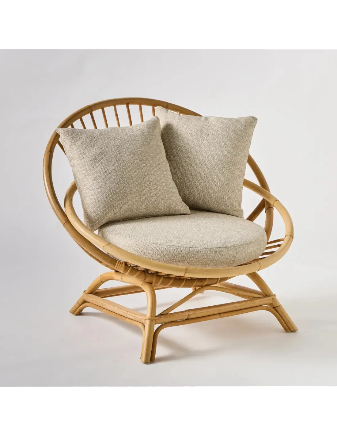 Dimensions hors tout : haut 88 x larg 100 x prof 92 cm, assise à 43 cm de hauteur, avec coussin. Livré monté, non empilable. Poids 10 kg avec coussin. Structure en rotin naturel non écorcé, vernis transparent mat cellulosique. 4 petits patins en nylon sous chaque pied. Coussin d'assise garni de mousse polyuréthane densité 30 kg/m3, coussins de dossiers garnis de ouate de polyester. Tous les coussins sont déhoussables et recouverts de tissu 100% polypropylène (oléfine) garanti anti UV, anti moisissures, et lavable. Fabrication Indonésie.