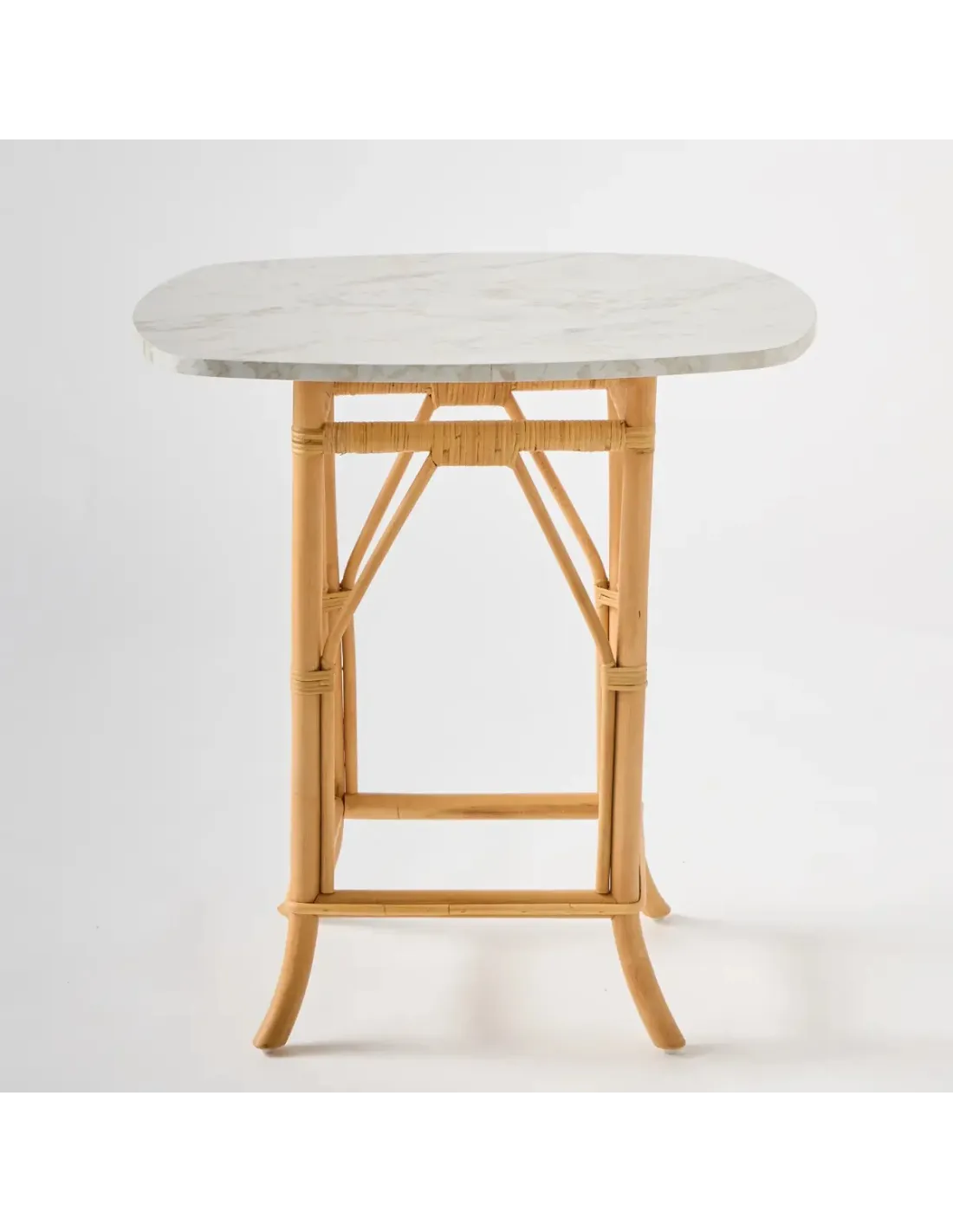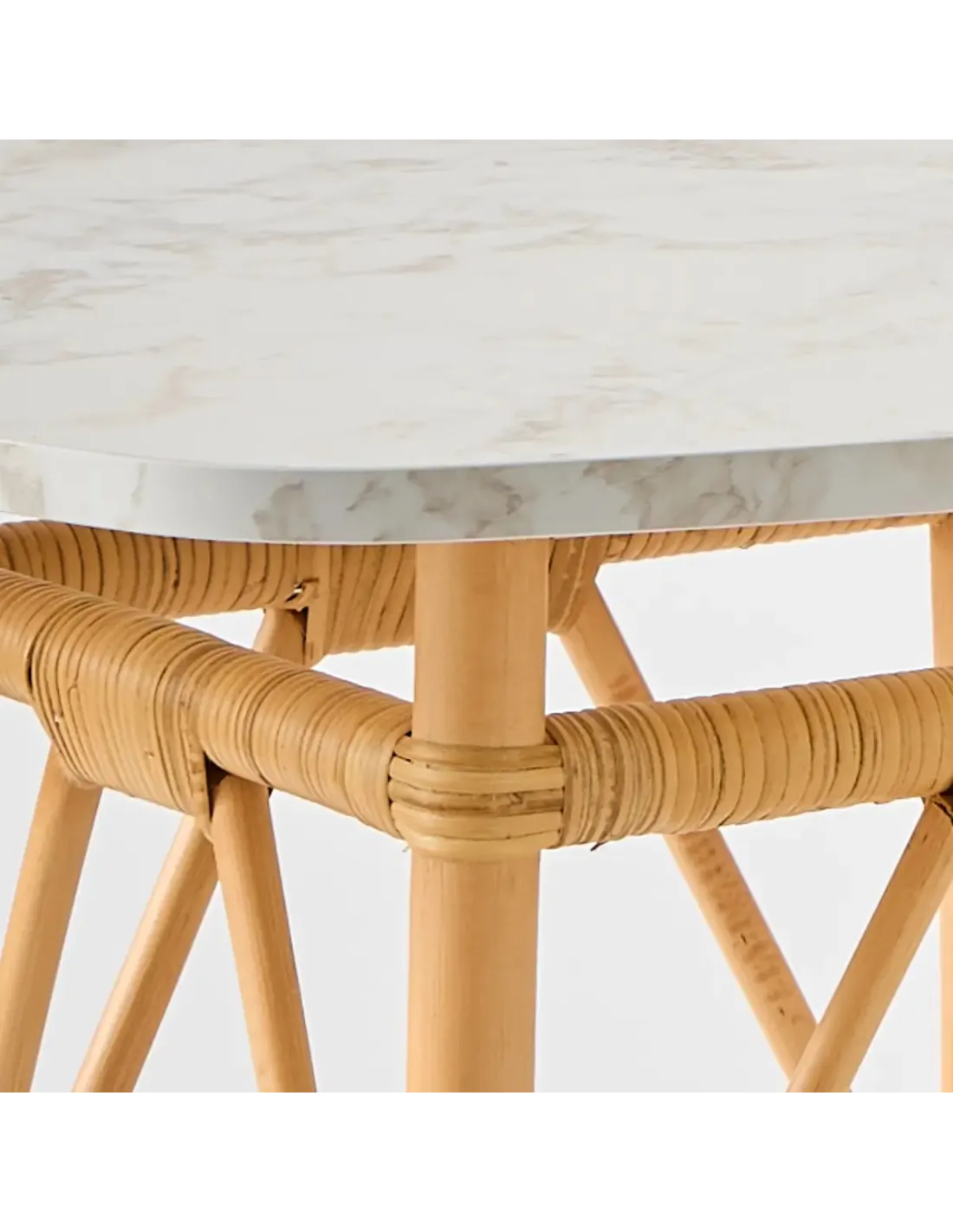 La table en rotin Eugénie abandonne ici son plateau rond en tissage de moelle de rotin pour se doter d'un plateau en panneau de particules stratifié haute pression HPL (High Pressure Laminated) au motif de marbre blanc. Sa découpe originale en faux carré de 70x70 cm à bords et coins arrondis sera idéale pour un coin repas deux personnes et laisser le passage sans risquer de se heurter à des coins saillants. On pourra egalement l'imaginer en piedestal pour luminaire, bibelot, ou plante. Le stratifié "effet marbre" se marie très bien avec le rotin naturel mais sera surtout très facile d'entretien. Sa surface lisse et veloutée ne craint pas les taches (se nettoie d'un coup d'éponge), et ne se raye pas facilement. Nul besoin donc de lui adjoindre un plateau verre.