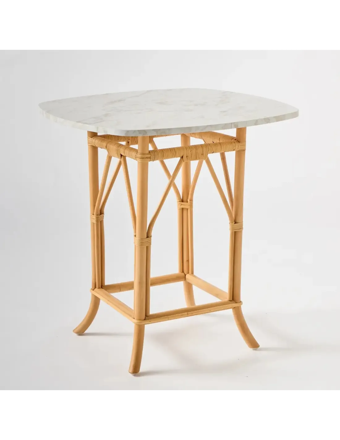 Dimensions hors tout : Hauteur 75 cm x 70 x 70 cm. Poids 8.5 kg. Livrée montée. Structure en rotin non écorcé, patins plastique sous chaque pied, fabriqué en Indonésie. Plateau en panneau de particules agglomérées stratifié haute pression décor marbre blanc épaisseur 18 mm, fabriqué en Belgique.