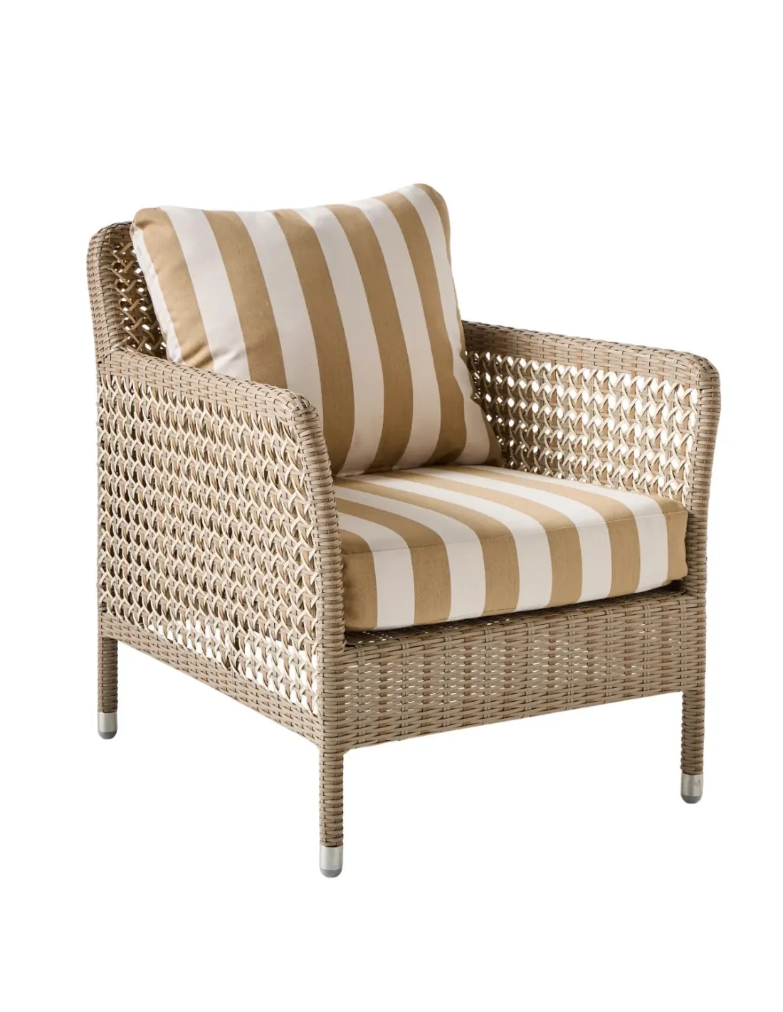Le fauteuil en résine Antibes conjugue sobriété des lignes et raffinement du travail de tressage "double -peau", tout à fait dans l'esprit de KOK MAISON. Nous rendons ici hommage à une tradition pluriséculaire des métiers du rotin, le fameux cannage ouvert "à la française", en l'adaptant à l'air du temps: des "mailles" à grande ouverture pour un aspect plus contemporain, l'emploi d'une résine outdoor robuste et facile d'entretien, et une harmonie précieuse de 3 gris beiges en camaïeu, inspirée des différentes couleurs naturelles de rochers à marée basse. La faible épaisseur des accoudoirs et du dossier permet de réduire l'encombrement du fauteuil sans rien sacrifier à son confort. Ce classique revisité se glissera partout, même dans des espaces restreints, en bord de mer, mais aussi dans le cadre d'une demeure de caractère en pierre, d'un relais-château, d'une terrasse en ville, d'un chalet à la montagne....