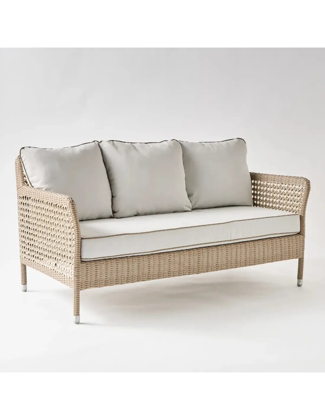 Dimensions hors tout : haut 75 x larg 147 x prof 75 cm, assise à 41 cm (avec coussin). Poids 13 kg avec coussins. Structure alu thermolaqué, tressage en résine PEHD. Fabrication Indonésie. Coussin en mousse polyuréthane densité 30 kg pour l'assise et garnis de ouate de polyester pour les coussins de dossier. Tous les coussins sont déhoussables. Tous les tissus proposés sont traités anti UV et anti moisissures pour un usage extérieur. Tissu gris perle 100% oléfine. Tissus unis et rayés, 100% acrylique. Tissus bouquet 100% dralon. Le coussin en tissu gris perle est confectionné en Indonésie (prix de base). Les garnitures dans les autres tissus sont confectionnées en France à la demande, moyennant délai de 3 semaines environ et un supplément de prix.