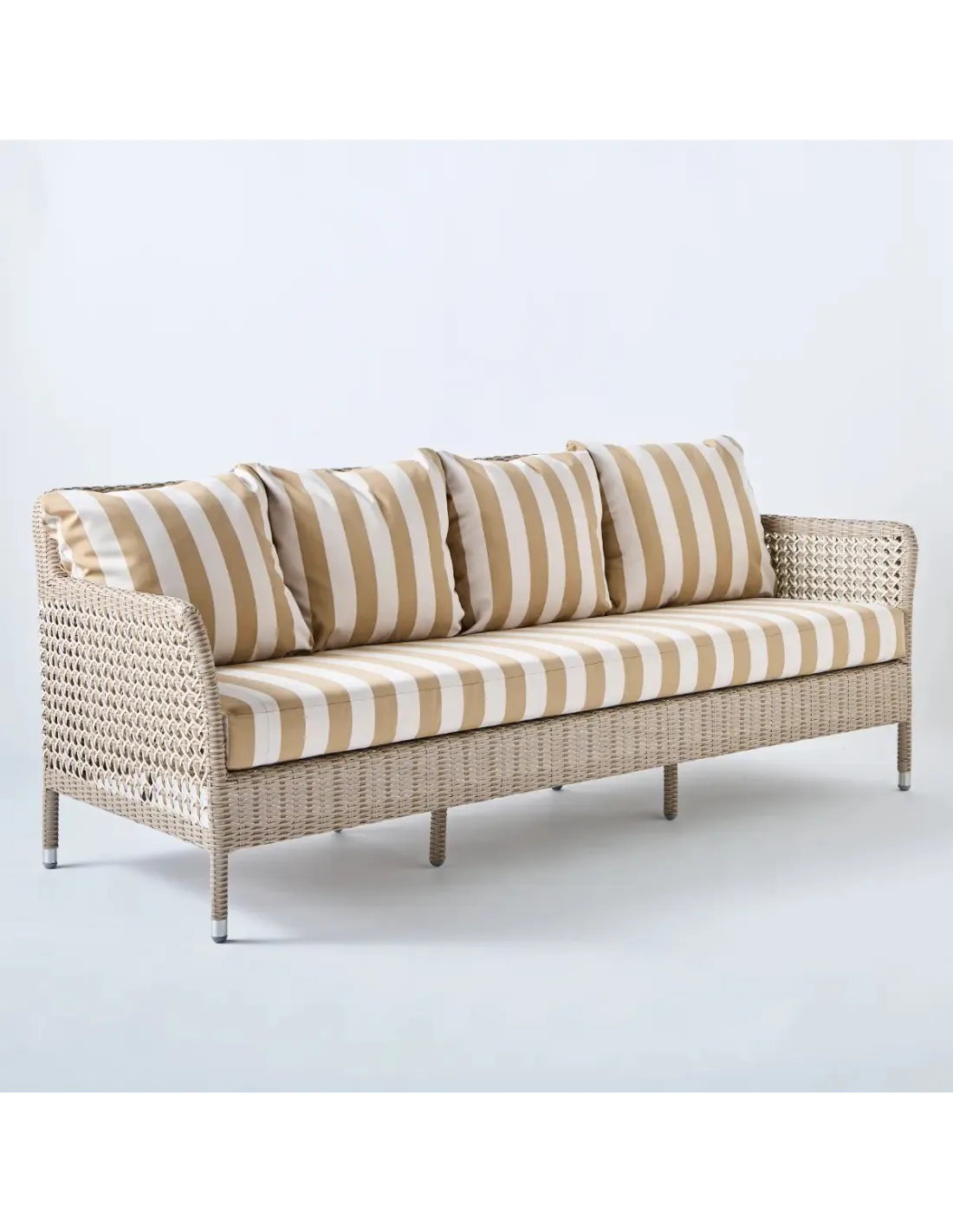 Dimensions hors tout : haut 75 x larg 190 x prof 75 cm, assise à 41 cm (avec coussin), largeur d'assise (entre accoudoirs): 176 cm. Poids 21 kg avec coussins. Structure alu thermolaqué, tressage en résine PEHD. Fabrication Indonésie. Coussin en mousse polyuréthane densité 30 kg pour l'assise et garnis de ouate de polyester pour les coussins de dossier. Tous les coussins sont déhoussables. Tous les tissus proposés sont traités anti UV et anti moisissures pour un usage extérieur. Tissu gris perle 100% oléfine. Tissus unis et rayés, 100% acrylique. Tissus bouquet 100% dralon. Le coussin en tissu gris perle est confectionné en Indonésie (prix de base). Les garnitures dans les autres tissus sont confectionnées en France à la demande, moyennant délai de 3 semaines environ et supplément de prix.