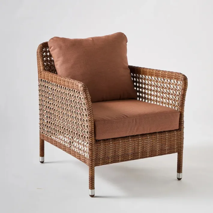 La résine coloris latérite de la collection Antibes est tressée en trois nuances de bruns-beiges" qui s'entremêlent en camaieu.