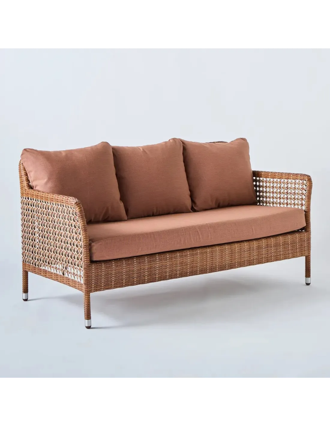 Le canapé 2 places en résine Antibes coloris latérite conjugue sobriété des lignes et raffinement du travail de tressage. Nous rendons ici hommage à une tradition ancestrale du métier du rotin, le fameux cannage ouvert "à la française", en le revisitant pour coller à l'air du temps: des "mailles" à grande ouverture plus contemporaines, l'emploi d'une résine outdoor robuste et facile d'entretien, un tressage "double -peau" et une harmonie précieuse de 3 bruns beiges en camaïeu, dont la dominante foncée reproduit le ton chaud des roches et terres tropicales. La faible épaisseur des accoudoirs et du dossier permet de réduire l''encombrement du canapé sans rien sacrifier à son confort. Idéal en bord de mer, mais aussi dans une demeure de caractère en pierre, un relais-château, une terrasse en ville, un chalet à la montagne.... Le canapé 2 places Antibes est pratiquement un 2 places 1/2. Sa largeur d'assise de 133 cm permet d'installer 2 personnes très à l'aise ou 3 personnes plus serrées. Nous avons donc d'office prévu 3 coussins de dossier.