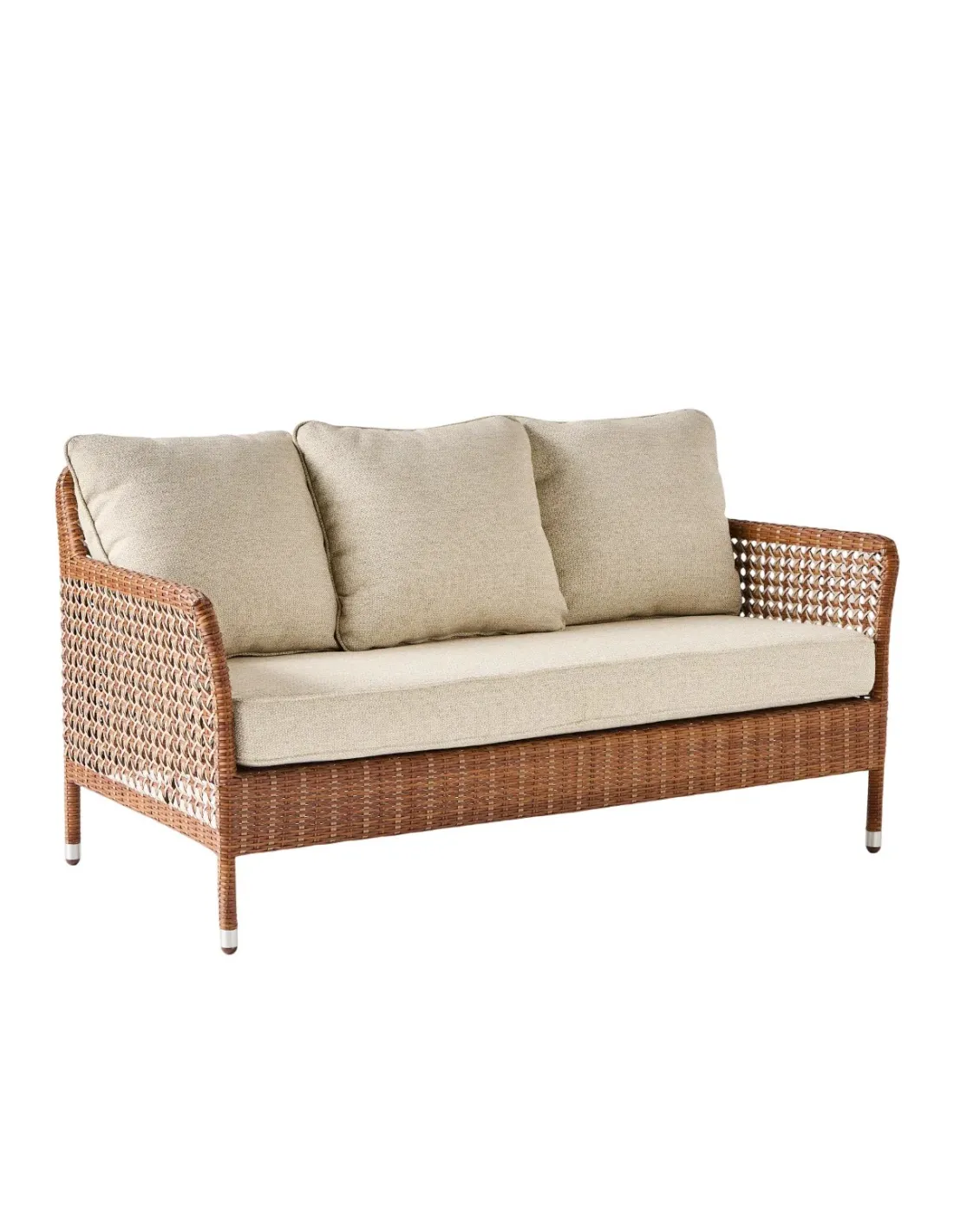 Le canapé 2 places en résine Antibes coloris latérite conjugue sobriété des lignes et raffinement du travail de tressage. Nous rendons ici hommage à une tradition ancestrale du métier du rotin, le fameux cannage ouvert "à la française", en le revisitant pour coller à l'air du temps : des "mailles" à grande ouverture plus contemporaines, l'emploi d'une résine outdoor robuste et facile d'entretien, un tressage "double peau" et une harmonie précieuse de 3 bruns beiges en camaïeu, dont la dominante foncée reproduit le ton chaud des roches et terres tropicales. La faible épaisseur des accoudoirs et du dossier permet de réduire l'encombrement du canapé sans rien sacrifier à son confort. Idéal en bord de mer, mais aussi dans une demeure de caractère en pierre, un relais-château, une terrasse en ville, un chalet à la montagne... Le canapé 2 places Antibes est pratiquement un 2 places 1/2. Sa largeur d'assise de 133 cm permet d'installer 2 personnes très à l'aise ou 3 personnes plus serrées. Nous avons donc d'office prévu 3 coussins de dossier.