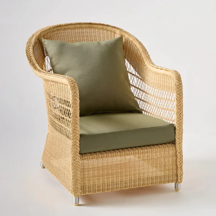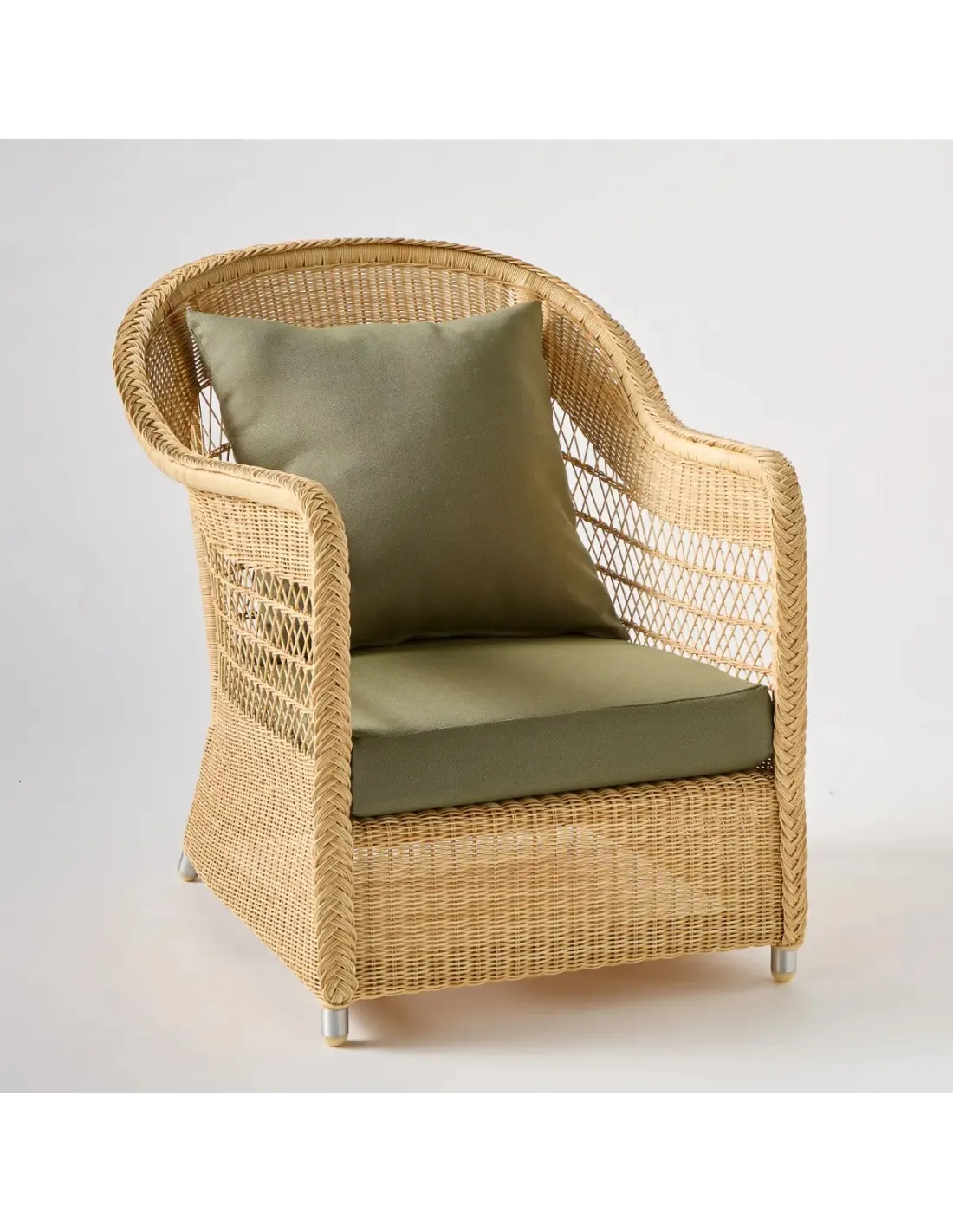 Le fauteuil en rotin d'extérieur BIARRITZ est présenté ici en résine coloris naturel avec notre séléction de tissus outdoor. La collection BIARRITZ s'inspire du mobilier en rotin ou en osier que l'on trouvait sous les auvents ou dans les jardins d'hiver des maisons bourgeoises de la fin du XiX ème siècle. On y retrouve en particulier cette façon typique de tresser en "ajouré" dégageant des motifs en losange dans les parties ouvertes. L'emploi d'une résine aussi fine que résistante renforce encore l'impression de légèreté et de raffinement de ce tressage exclusif proche d'un travail de dentelle.