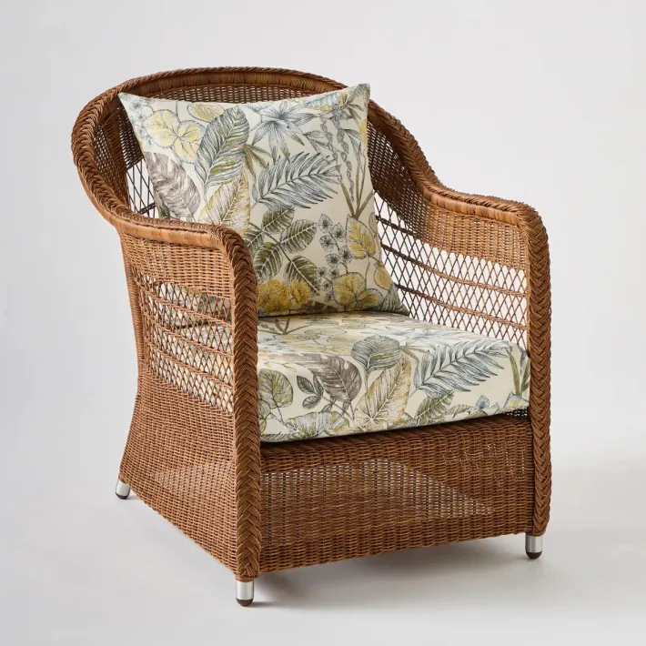 Le fauteuil en rotin d'extérieur BIARRITZ est présenté ici en résine coloris châtaigne avec notre séléction de tissus outdoor. La collection BIARRITZ s'inspire du mobilier en rotin ou en osier que l'on trouvait sous les auvents ou dans les jardins d'hiver des maisons bourgeoises de la fin du XiX ème siècle. On y retrouve en particulier cette façon typique de tresser en "ajouré" dégageant des motifs en losange dans les parties puvertes. L'emploi d'une résine aussi fine que résistante renforce encore l'impression de légèreté et de raffinement de ce tressage exclusif proche d'un travail de dentelle.