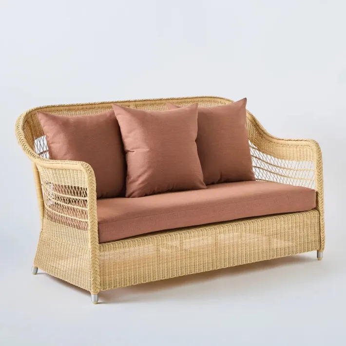 Le canapé 2 places en rotin d'extérieur BIARRITZ est présenté ici en résine coloris naturel avec notre séléction de tissus outdoor. La collection BIARRITZ s'inspire du mobilier en rotin ou en osier que l'on trouvait sous les auvents ou dans les jardins d'hiver des maisons bourgeoises de la fin du XiX ème siècle. On y retrouve en particulier cette façon typique de tresser en "ajouré" dégageant des motifs en losange dans les parties puvertes. L'emploi d'une résine aussi fine que résistante renforce encore l'impression de légèreté et de raffinement de ce tressage exclusif proche d'un travail de dentelle. Le canapé 2 places Biarritz est pratiquement un 2 places 1/2. Sa largeur d'assise de 125 cm permet d'installer 2 personnes très à l'aise ou 3 personnes plus serrées. Nous avons donc d'office prévu 3 coussins de dossier.