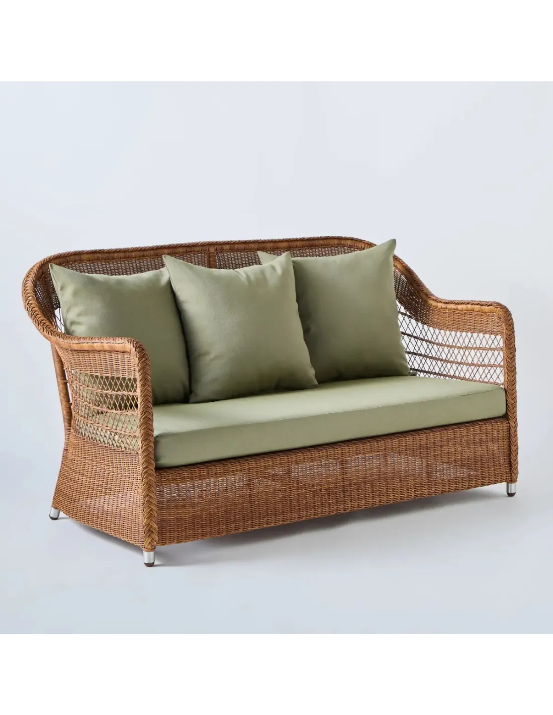 Dimensions hors tout : haut 81 x larg 145 x prof 81 cm, assise à 38 cm (avec coussin). Poids 21 kg avec coussins. Structure alu thermolaqué, tressage en résine PEHD.Fabrication Indonésie.  Coussin en mousse polyuréthane densité 30 kg pour l'assise et garnis de ouate de polyester pour le coussin de dossier. Tous les coussins sont déhoussables. Tous les tissus proposés sont traités anti UV et anti moisissures pour un usage extérieur. Tissu chenillé gris 100% oléfine. Tissus unis et rayés, 100% acrylique. Tissu bouquet 100% dralon. Les coussins en tissu gris chenilé sont confectionnés en Indonésie (prix de base). Les garnitures dans les autres tissus sont confectionnées en France à la demande, moyennant délai de 3 semaines environ et supplément.