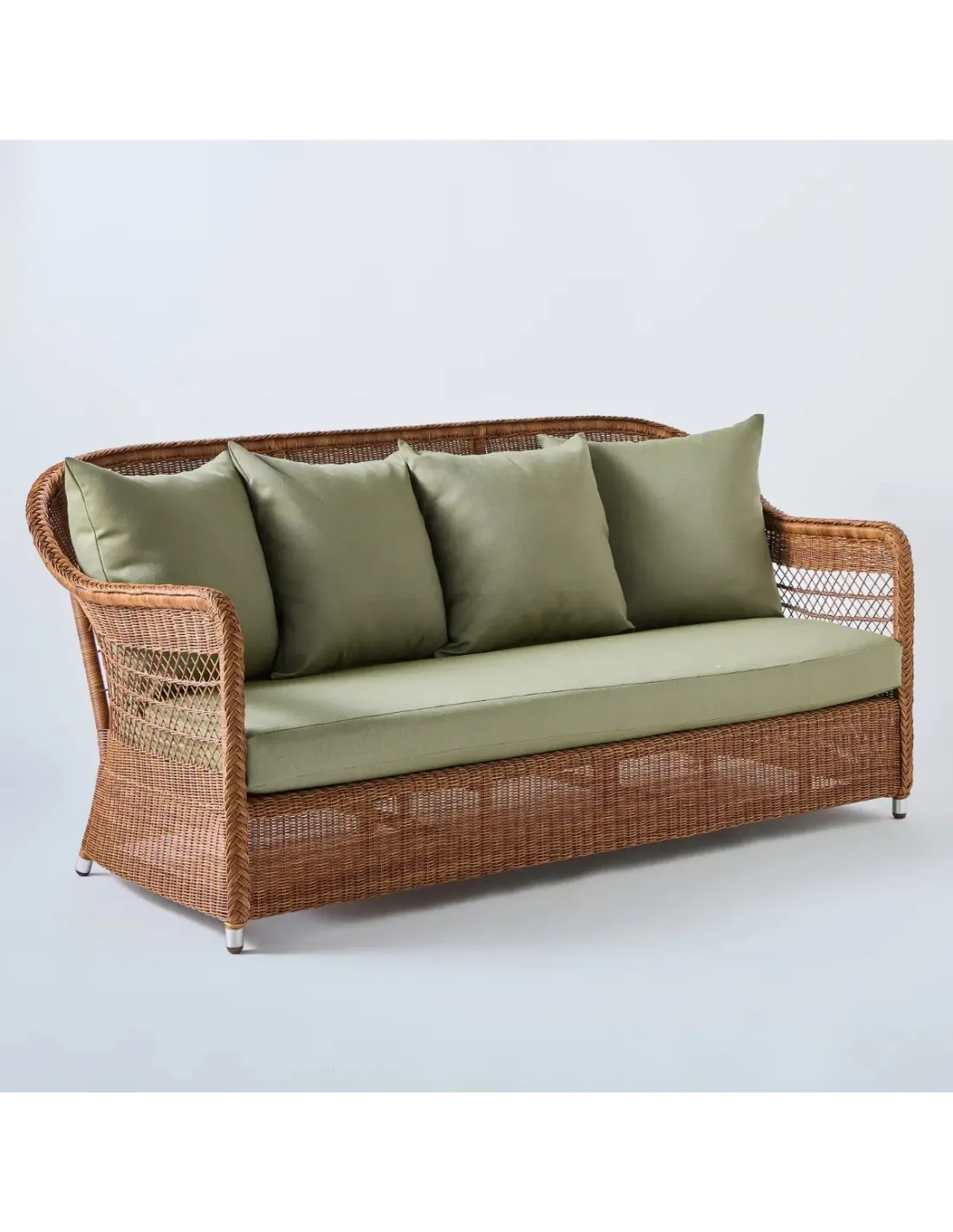 Le canapé 3 places en rotin d'extérieur BIARRITZ est présenté ici en résine coloris châtaigne avec notre séléction de tissus outdoor. La collection BIARRITZ s'inspire du mobilier en rotin ou en osier que l'on trouvait sous les auvents ou dans les jardins d'hiver des maisons bourgeoises de la fin du XiX ème siècle. On y retrouve en particulier cette façon typique de tresser en "ajouré" dégageant des motifs en losange dans les parties puvertes. L'emploi d'une résine aussi fine que résistante renforce encore l'impression de légèreté et de raffinement de ce tressage exclusif proche d'un travail de dentelle.