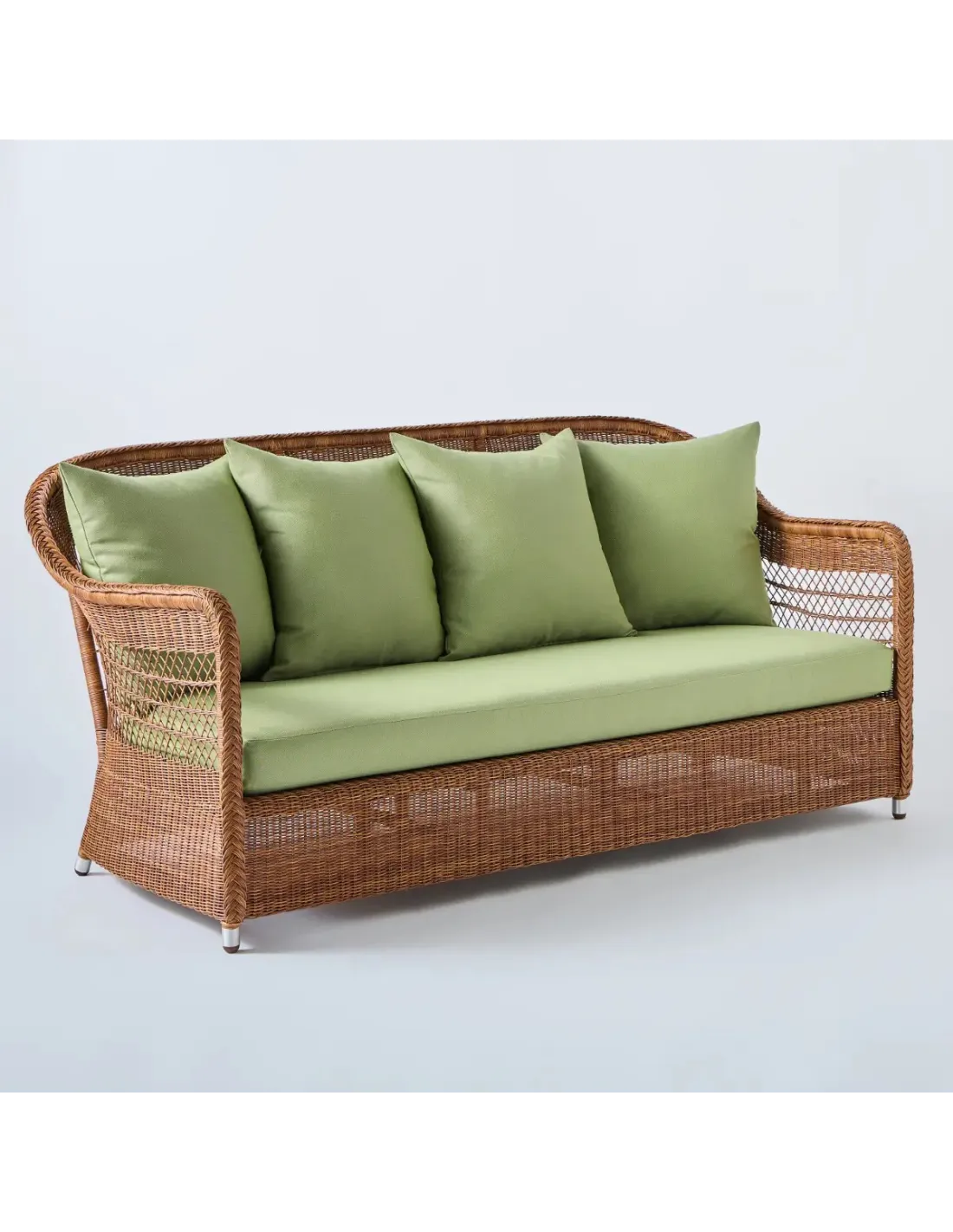 Le canapé 3 places en rotin d'extérieur BIARRITZ est présenté ici en résine coloris châtaigne avec notre séléction de tissus outdoor. La collection BIARRITZ s'inspire du mobilier en rotin ou en osier que l'on trouvait sous les auvents ou dans les jardins d'hiver des maisons bourgeoises de la fin du XiX ème siècle. On y retrouve en particulier cette façon typique de tresser en "ajouré" dégageant des motifs en losange dans les parties puvertes. L'emploi d'une résine aussi fine que résistante renforce encore l'impression de légèreté et de raffinement de ce tressage exclusif proche d'un travail de dentelle.
