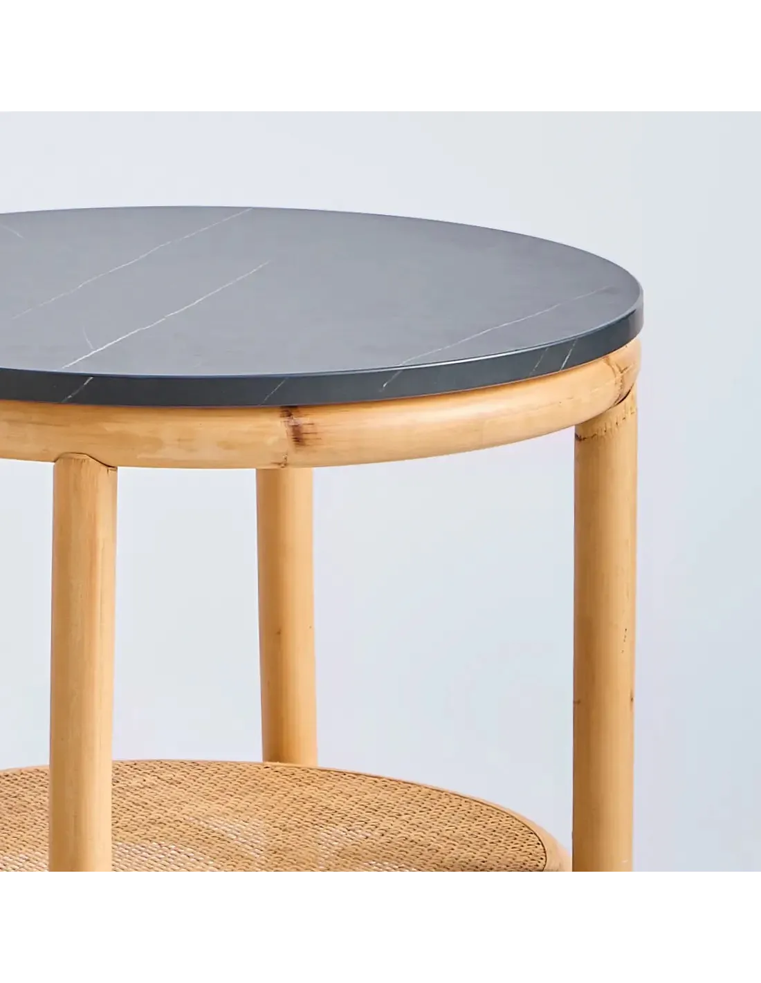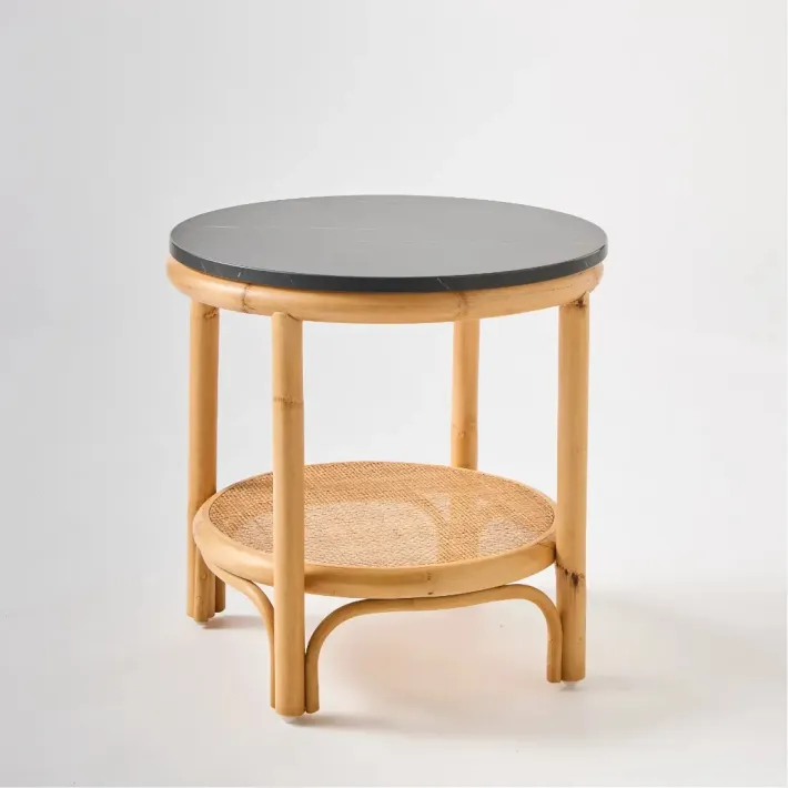 Détail petite table basse en rotin collection Riviera avec plateau stratifié effet marbre noir