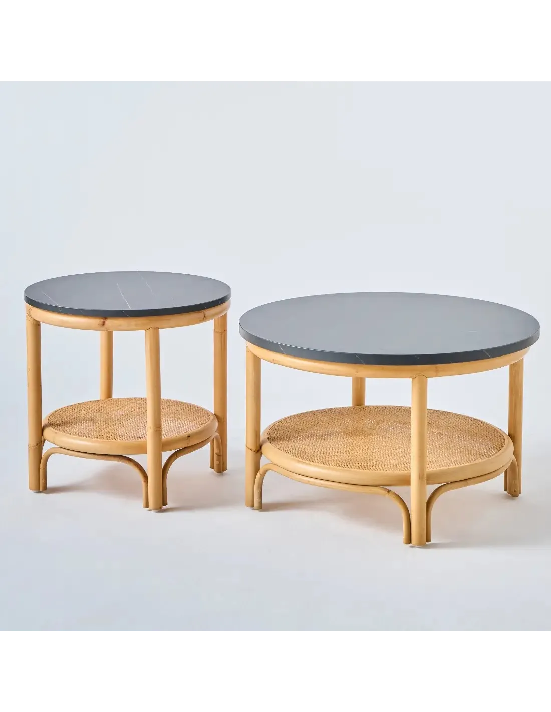 Duo petite et grande tables basses en rotin plateau stratifié effet marbre noir collection Riviera
