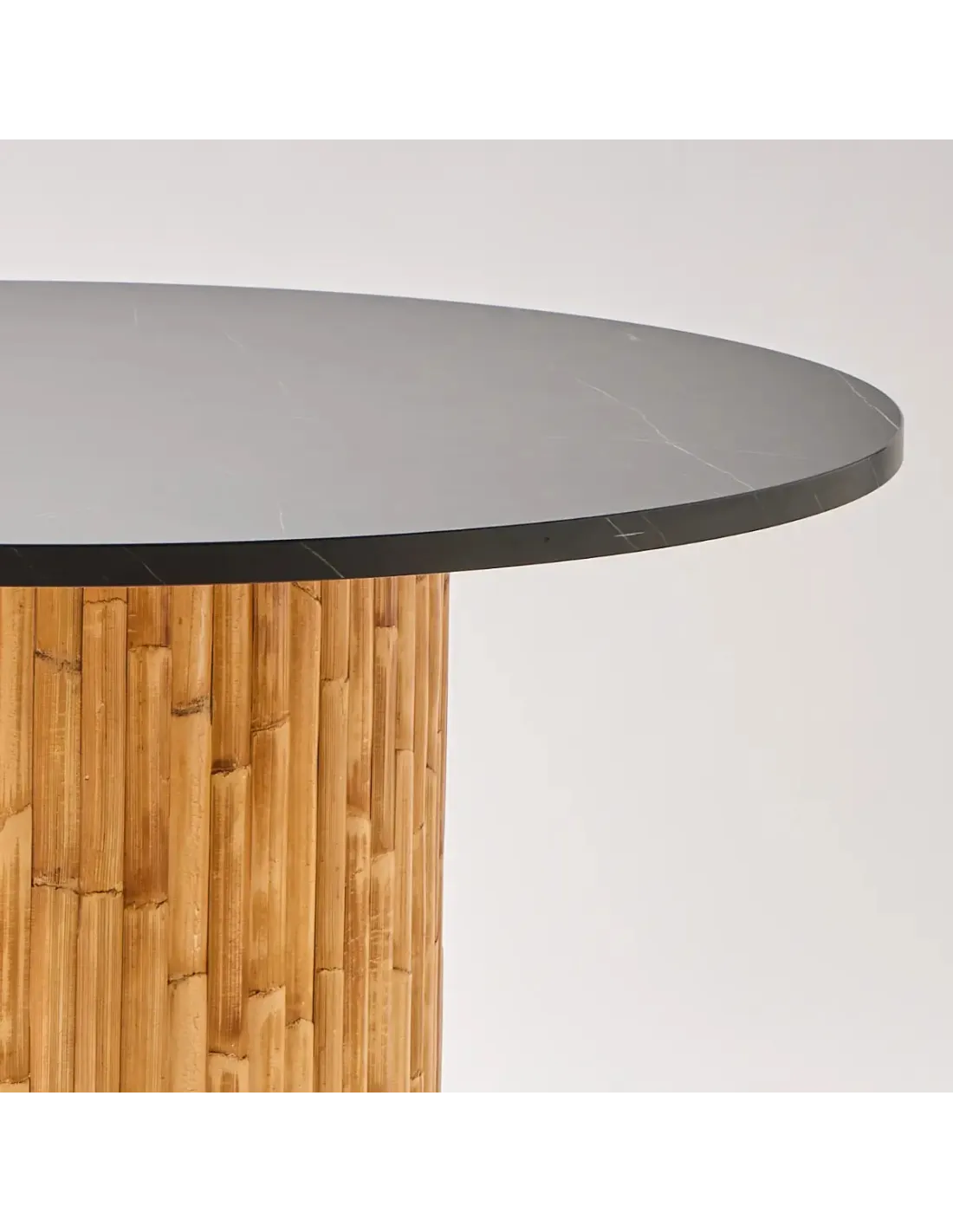 Table de repas ronde de diamètre 120 en rotin avec plateau stratifié effet marbre noir