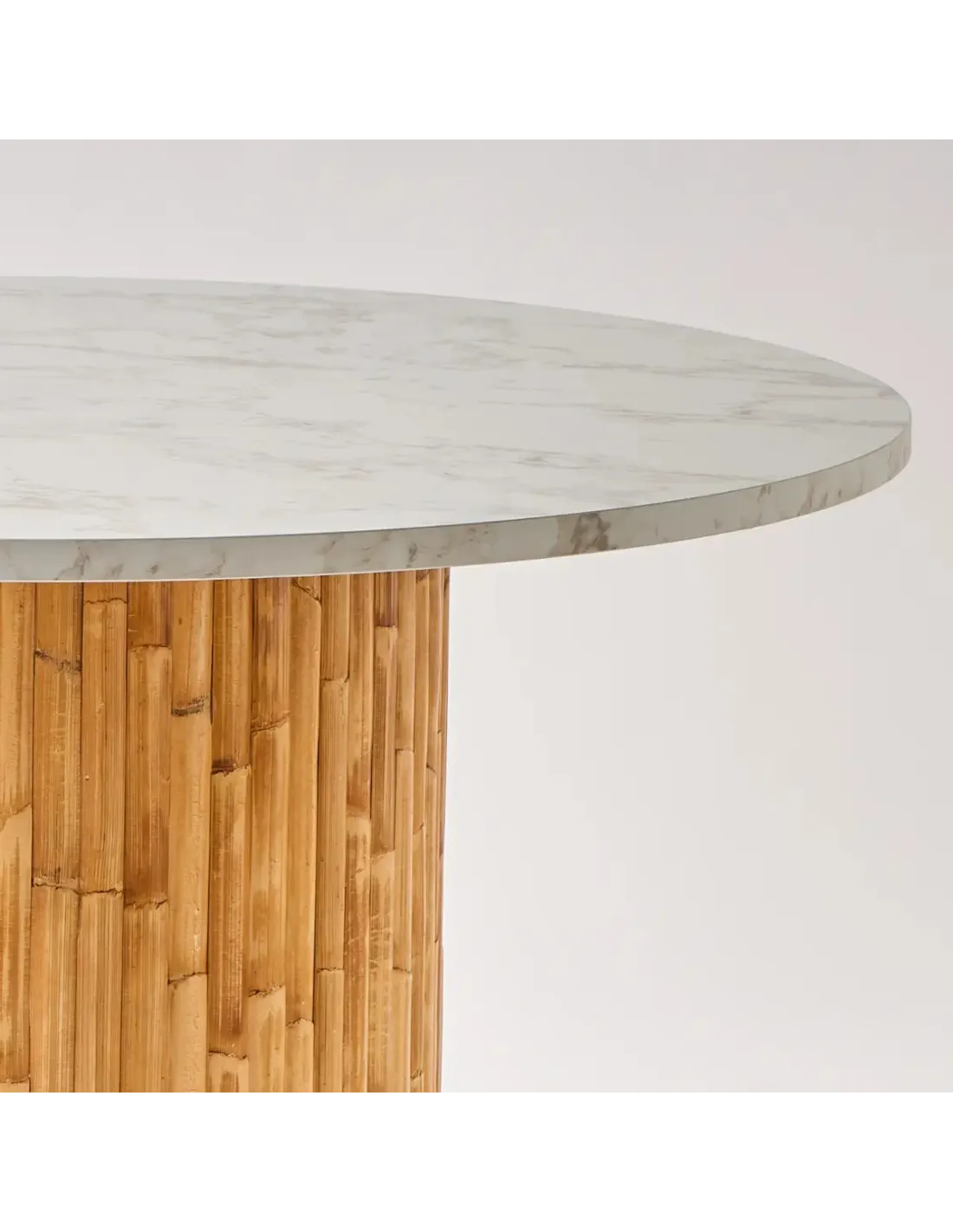 Zoom plateau HPL effet marbre blanc sur pied de table en rotin Riviera