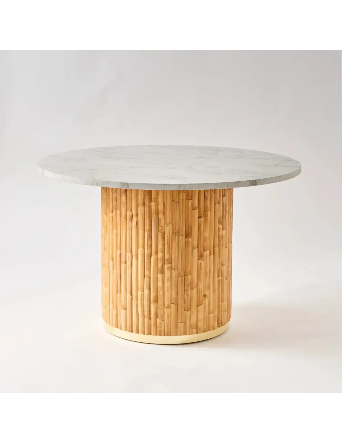 Table de repas ronde de diamètre 120 en rotin avec plateau stratifié effet marbre blanc