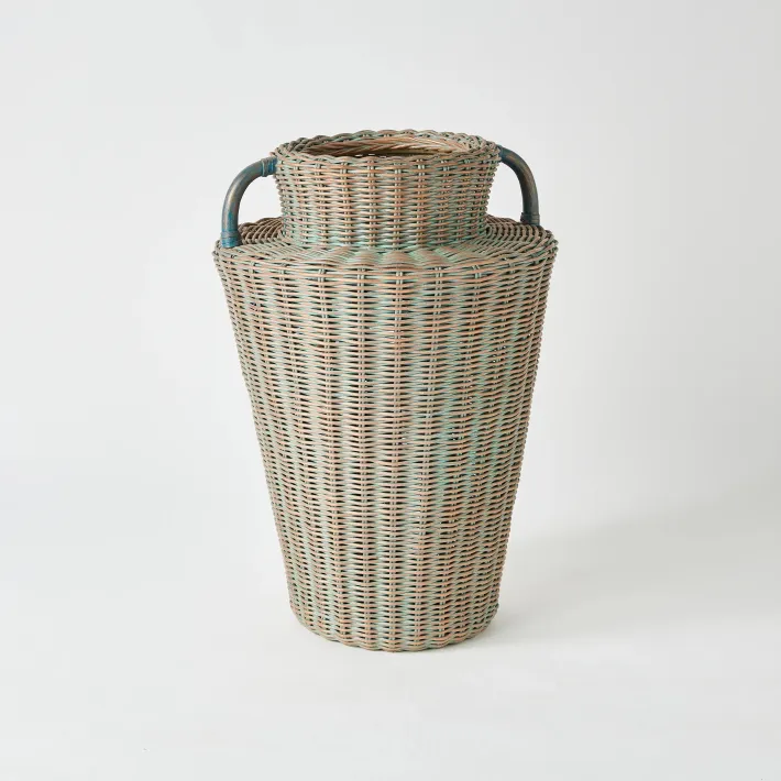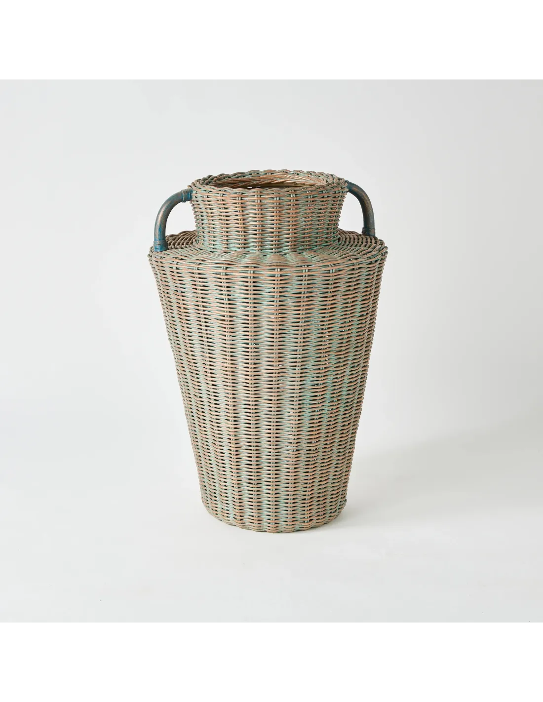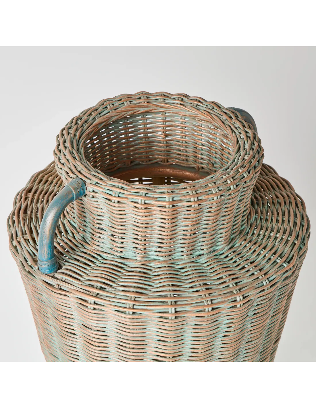 Structure en rotin habillé de tressage en moelle de rotin. Finition teintée, vernie et patinée turquoise. Hauteur 65 cm x diamètre 45 cm. Poids 3 kg. Fabrication Indonésie.