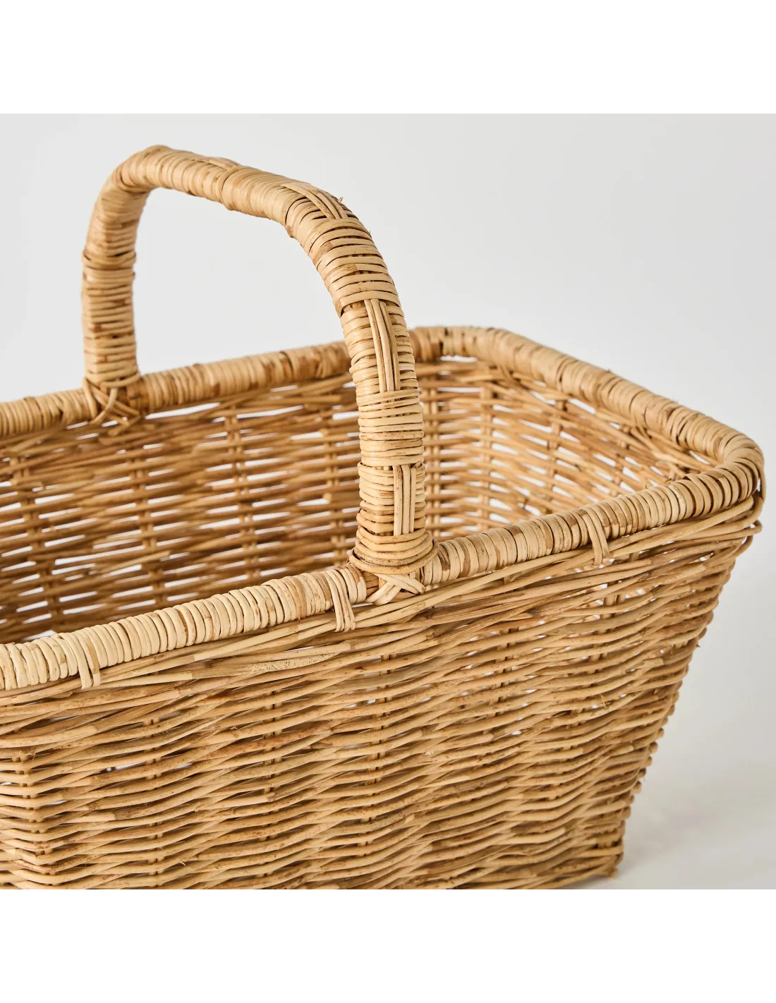 Tressage en rotin naturel . Hauteur 35 cm (avec anse) 20 cm (panier seul) x largeur 31 cm x longueur 40 cm. Poids 600 g. Fabrication Vietnam.