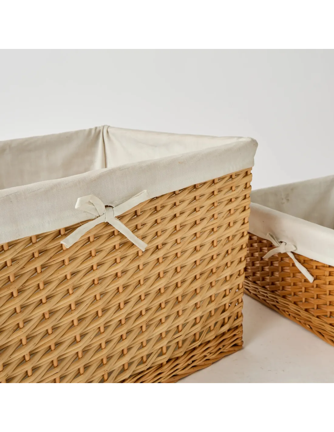 Un lot de paniers de rangement pouvant faire office de paniers à linge grâce à leur garniture en coton