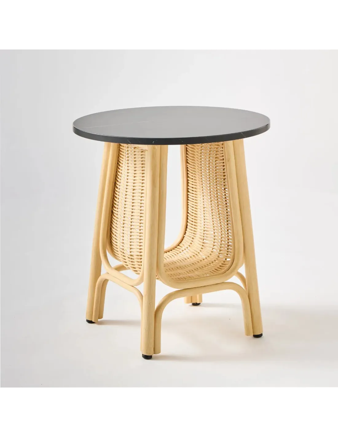 Structure : canne de rotin écorcée. Rangement tissé en moelle de rotin. Équipée ici d'un plateau en stratifié, décor marbre blanc ou marbre noir. Le stratifié ou HPL (high pressure laminated) est ce dont on fait les plans de travail de cuisine, il est particulièrement résistant et facile d'entretien. Finition vernis mat à l'eau. Chaque pied est équipé de patins double-face (une face nylon, une face feutre) permutables et remplaçables facilement. Dimensions hors-tout : diamètre 50 cm x hauteur 55 cm. Poids 4.5 kg. Fabrication Indonésie. Livrée montée.