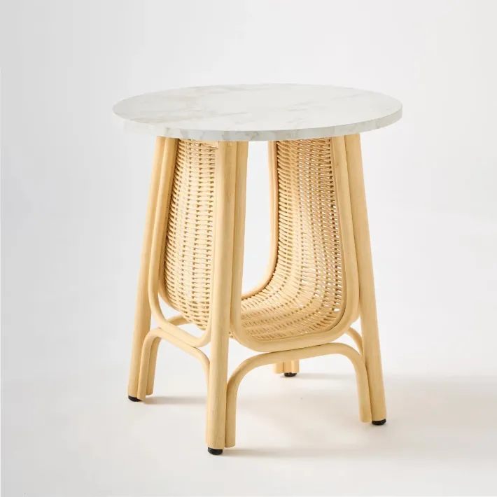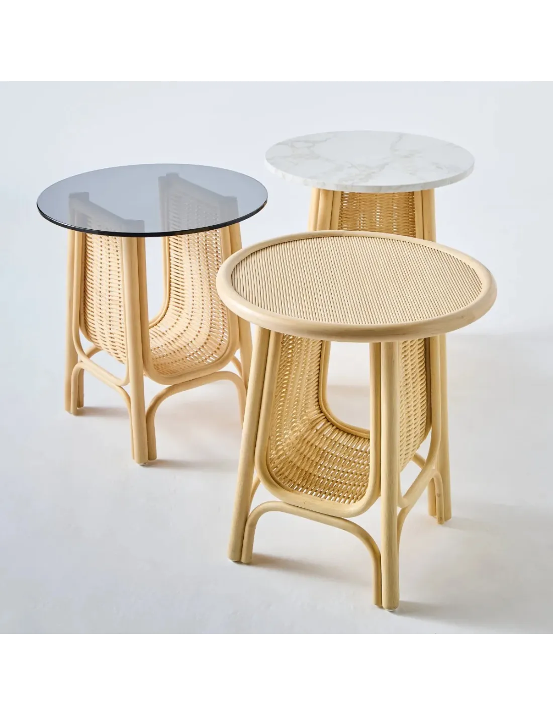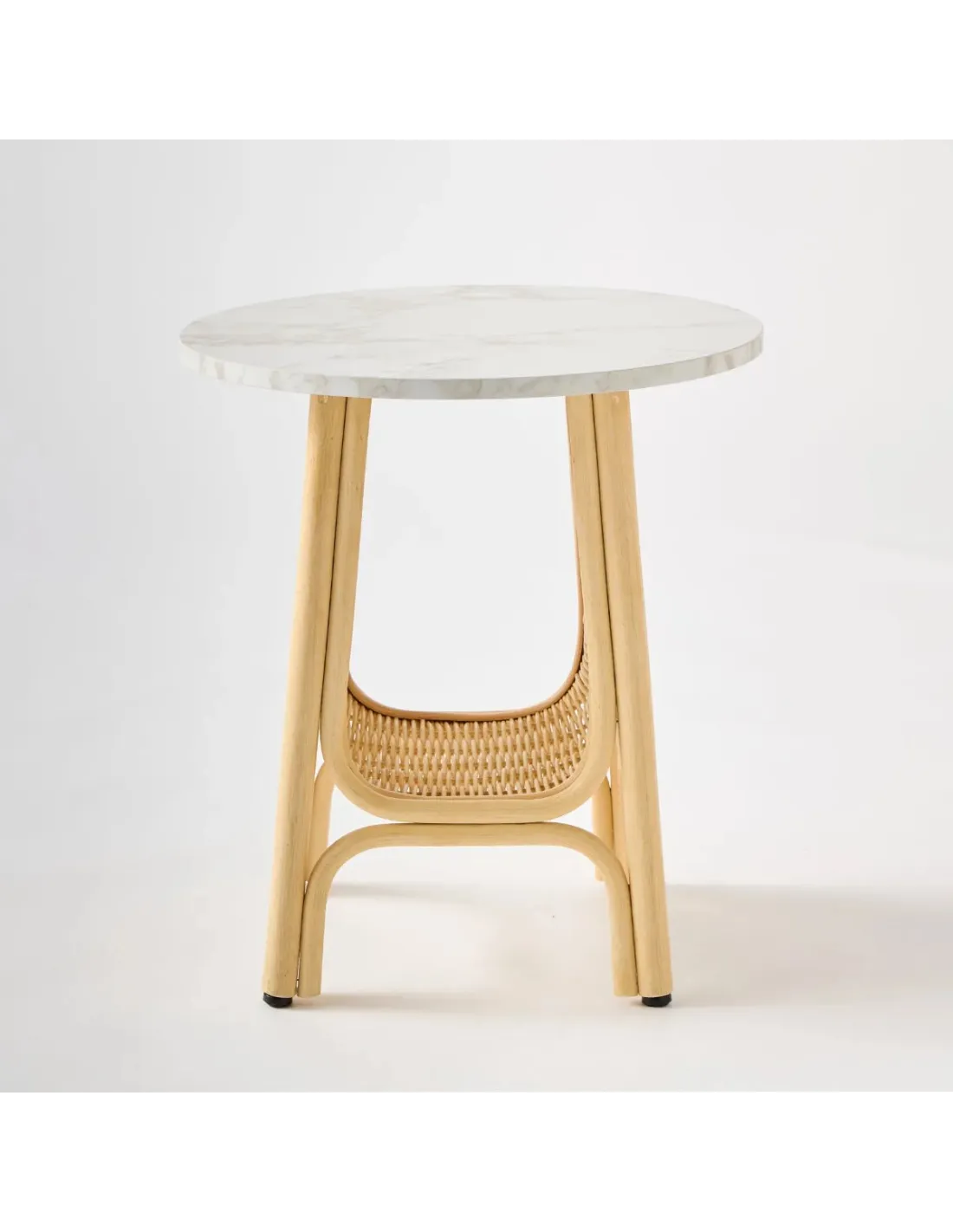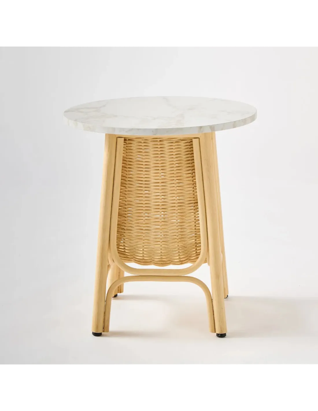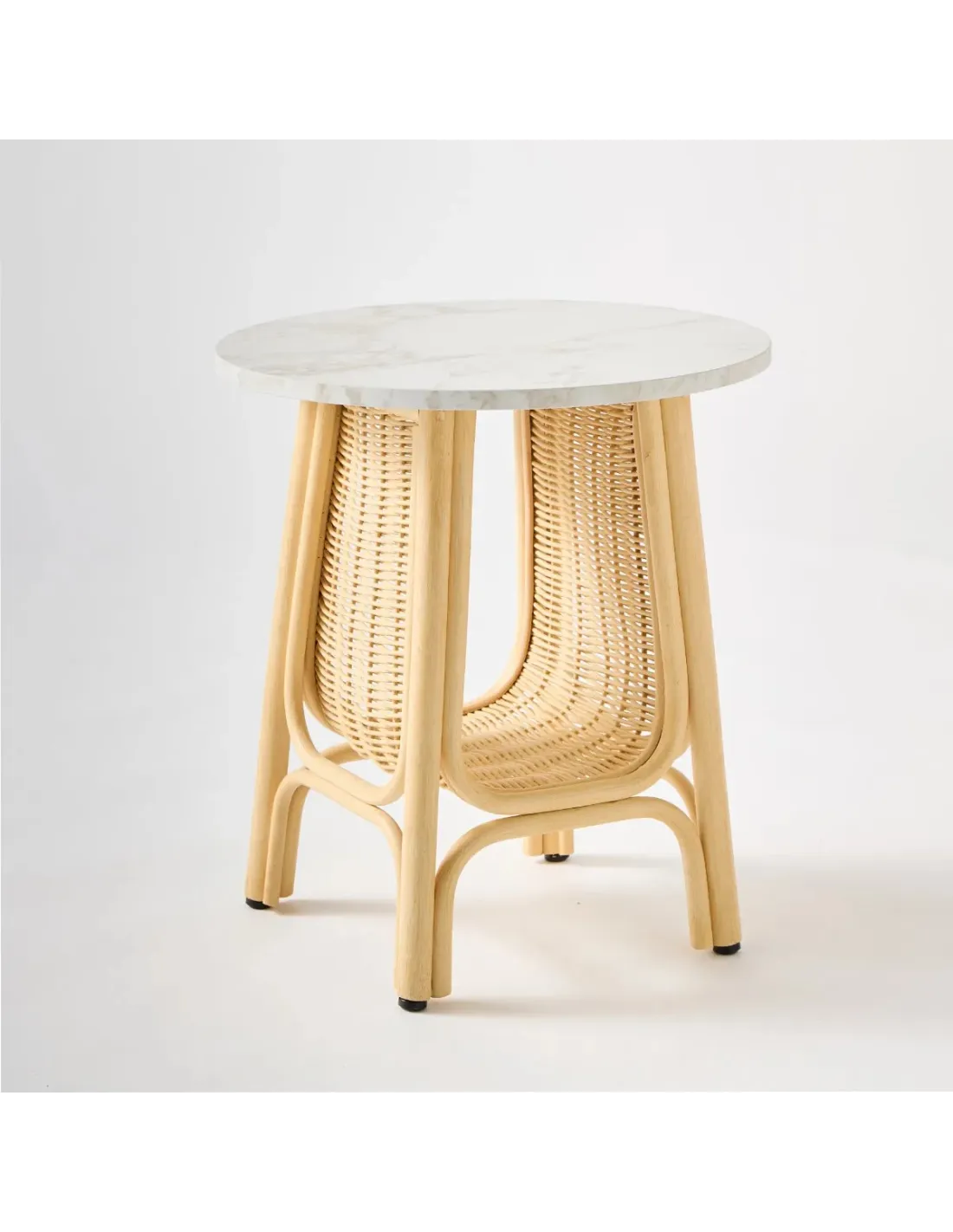 Structure : canne de rotin écorcée. Rangement tissé en moelle de rotin. Équipée ici d'un plateau en stratifié, décor marbre blanc ou marbre noir. Le stratifié ou HPL (high pressure laminated) est ce dont on fait les plans de travail de cuisine, il est particulièrement résistant et facile d'entretien. Finition vernis mat à l'eau. Chaque pied est équipé de patins double-face (une face nylon, une face feutre) permutables et remplaçables facilement. Dimensions hors-tout : diamètre 50 cm x hauteur 55 cm. Poids 4.5 kg. Fabrication Indonésie. Livrée montée.