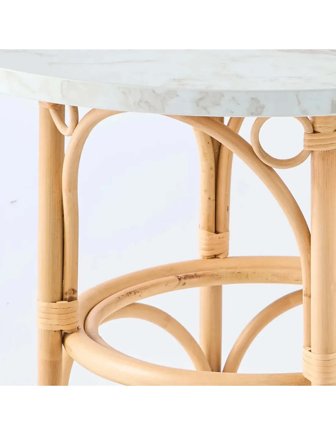 Structure en canne de rotin demi-écorcée, ligatures en éclisse de rotin, finition vernis naturel à l'eau. Chaque pied est équipé d'un patin en nylon. Plateau en stratifié HPL (high Pressure Laminated) effet marbre épaisseur 18 mm et 70 cm de diamètre.